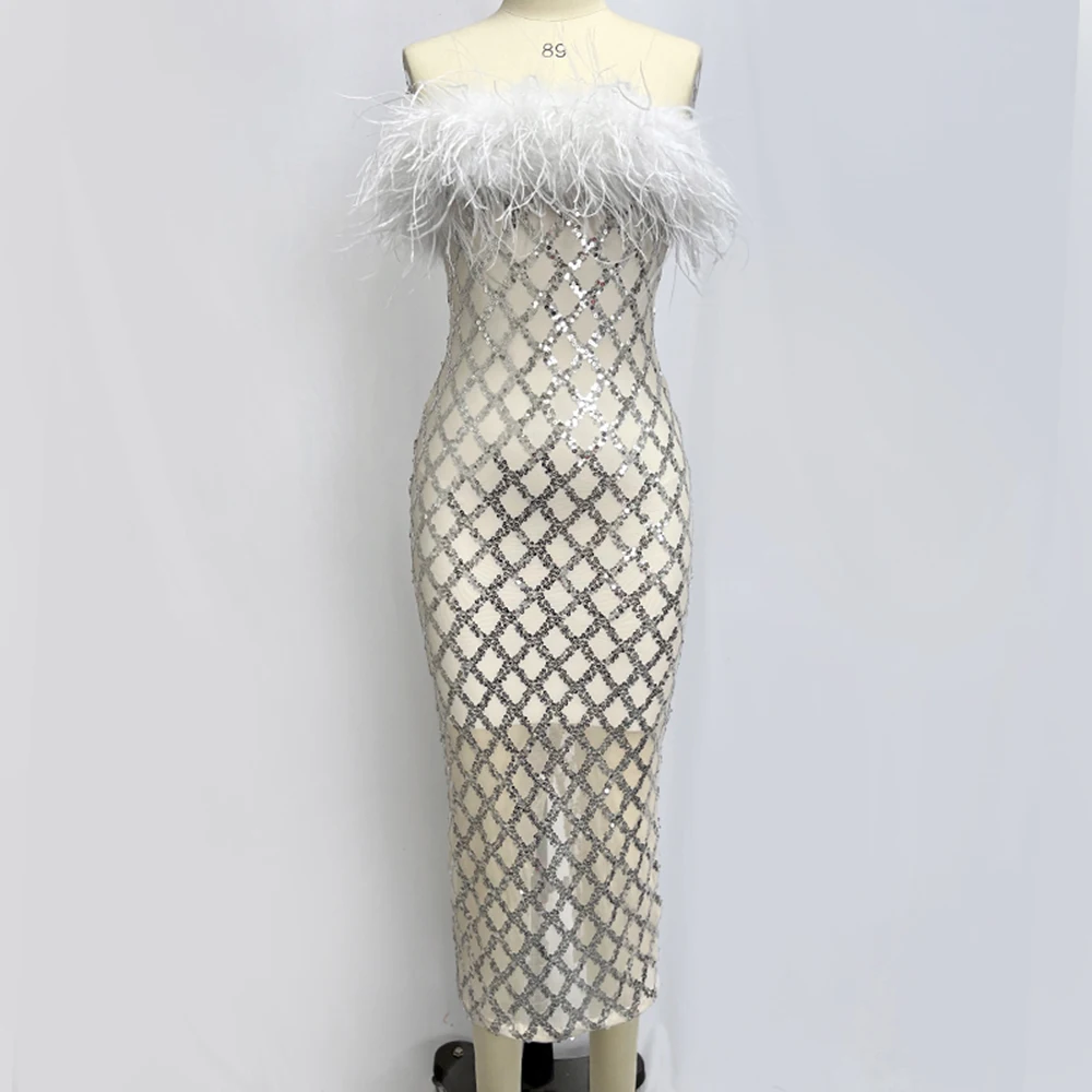 Strapless Sequin White Feather Midi Dress Elegant Celebrity Party Evening Dress