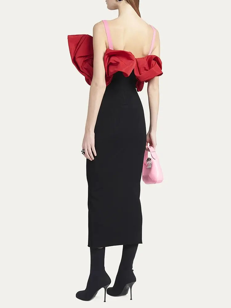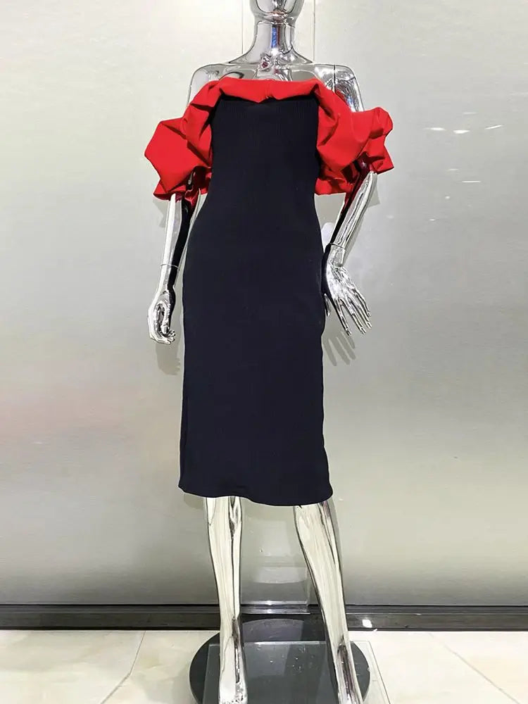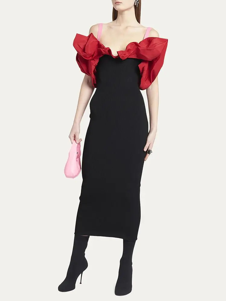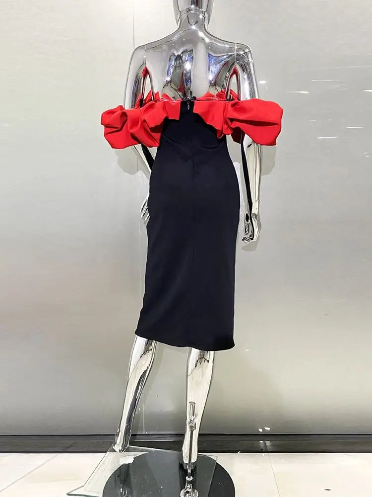 Red Black Ruffle Edge Sexy Off Shoulder Midi Bandage Dress Elegant Celebrity Party Dress
