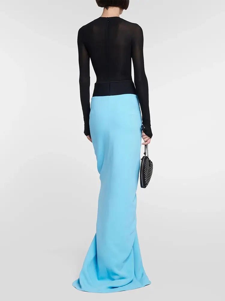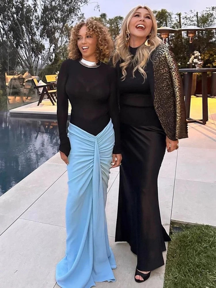 Dress Set Translucent Black Mesh Skin-Tight Garment+Drop Blue Fishtail Dress 2-Piece Sexy Elegant Set