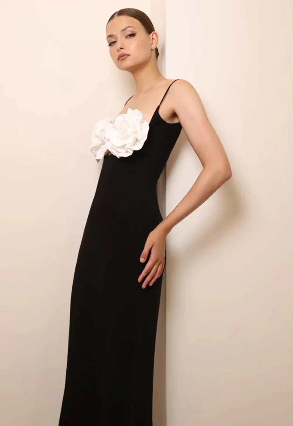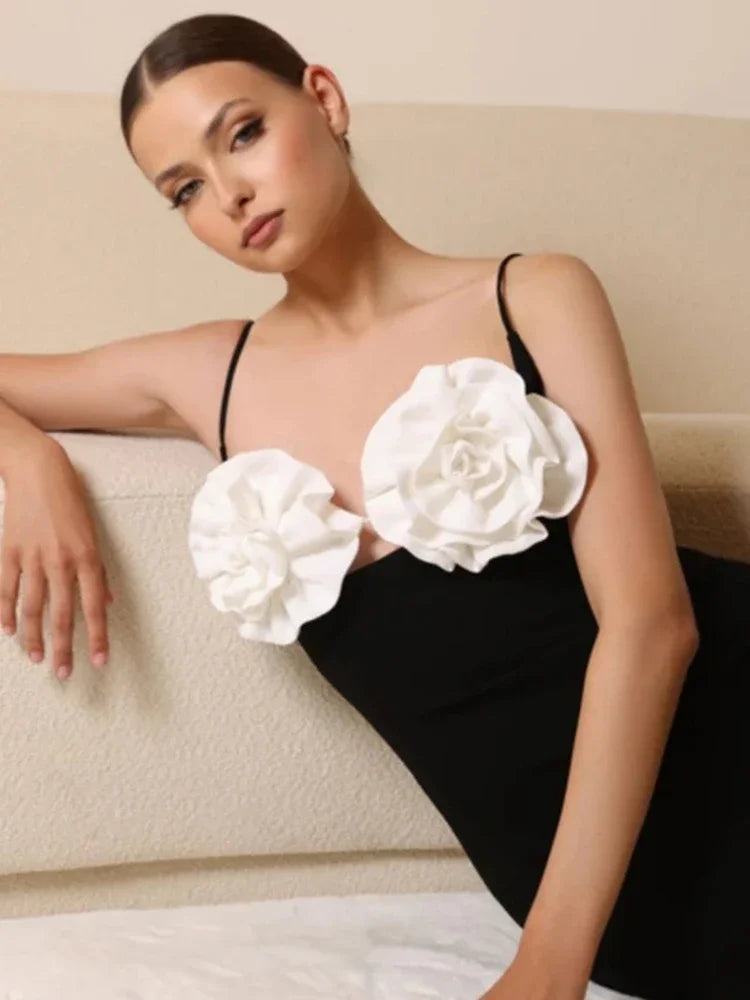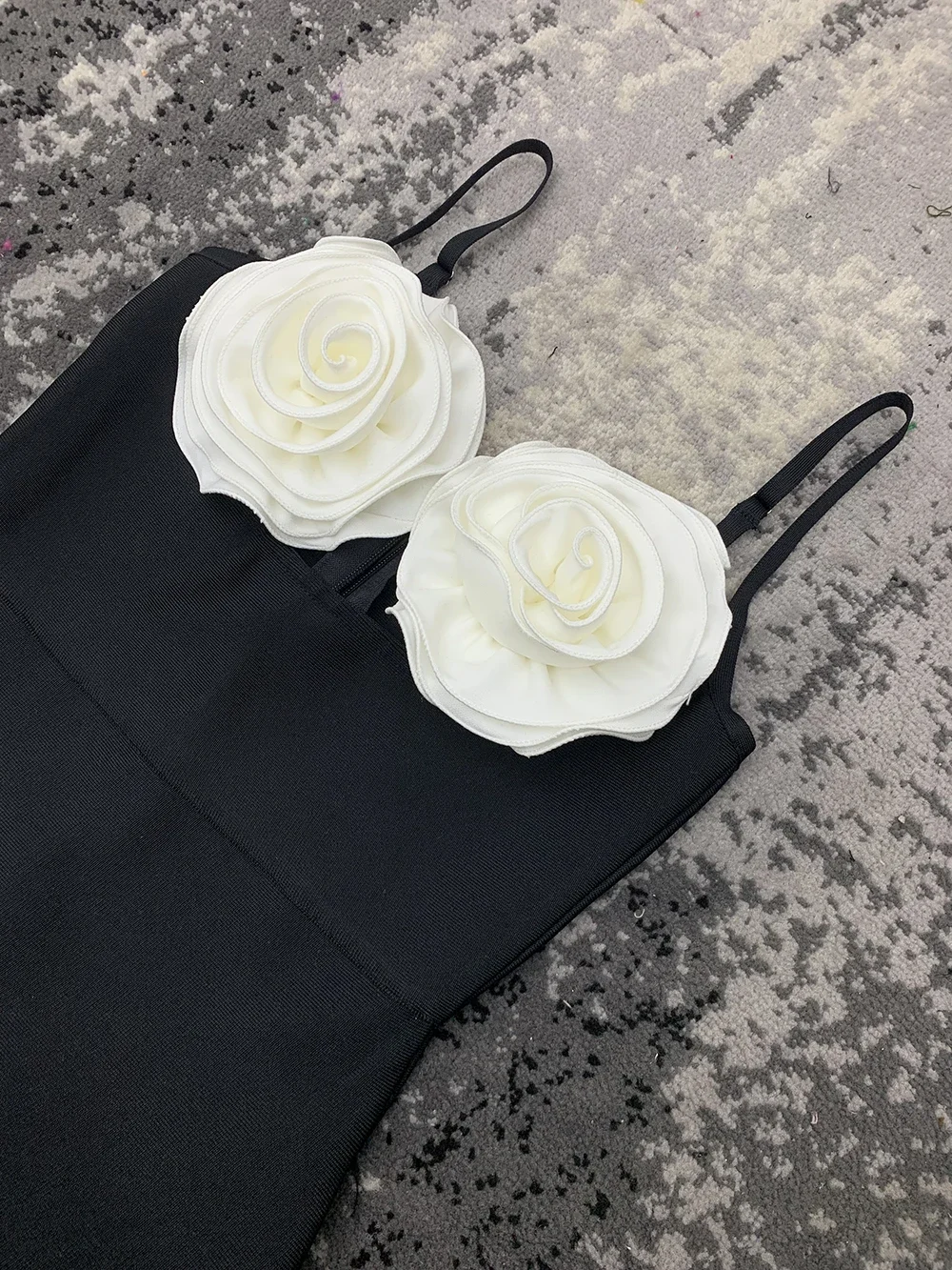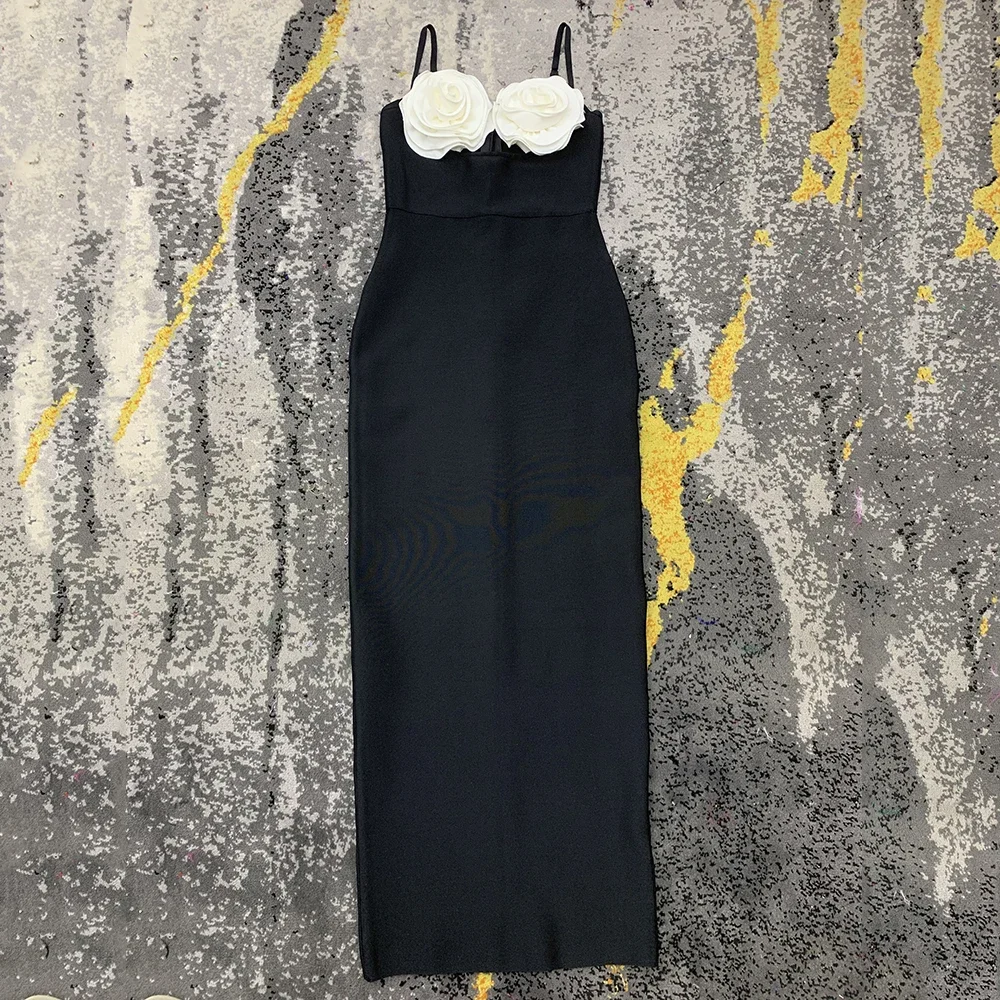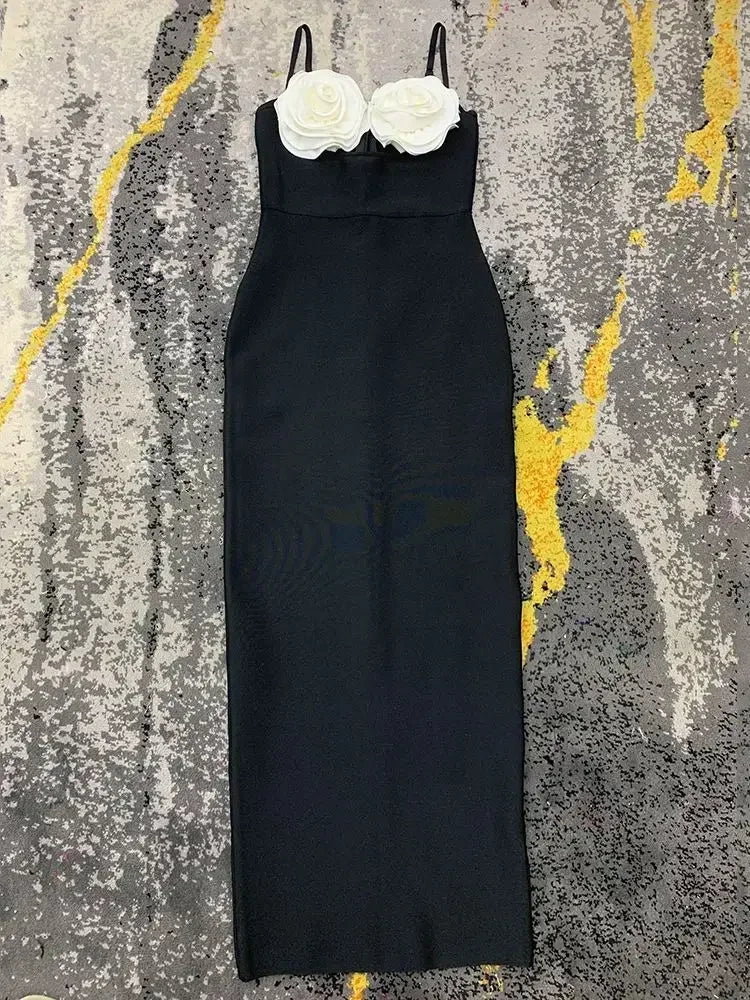 Hollow out Italian Noodle Strap 3D Flower Design Bandage Long Dress