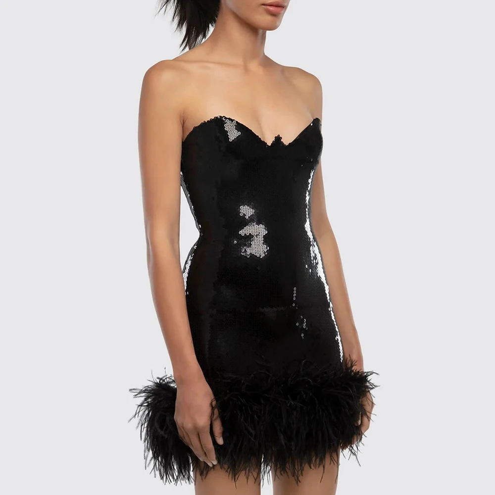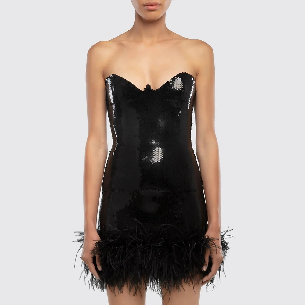Black Fashion Sequin Feather Strapless Mini Tight Mini Dress Elegant Celebrity Party Dress