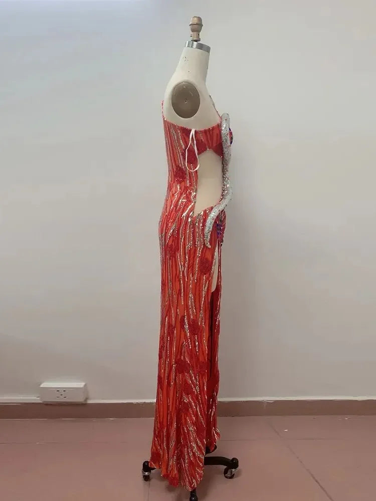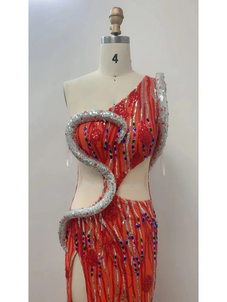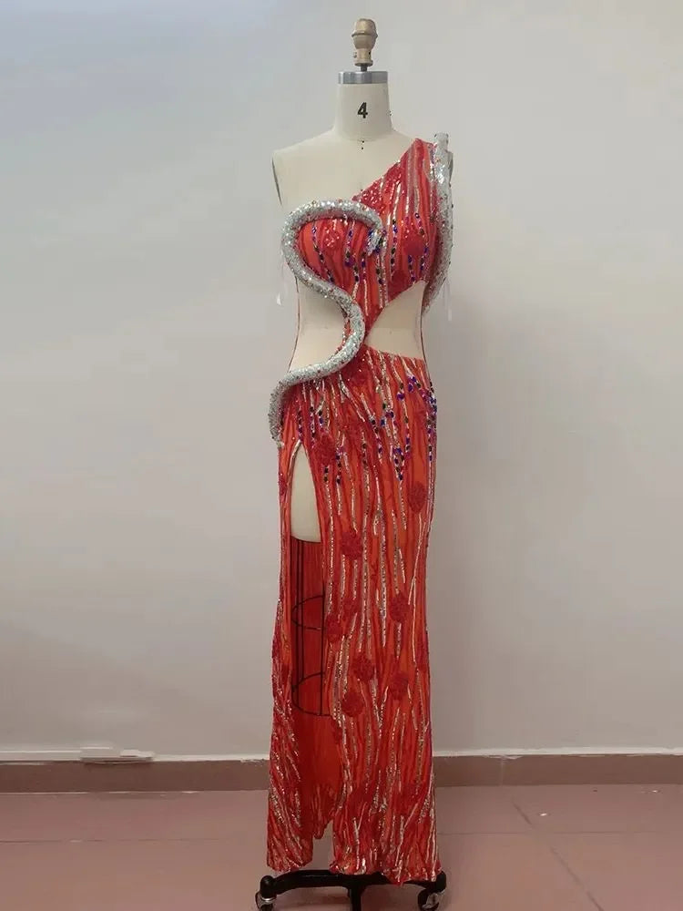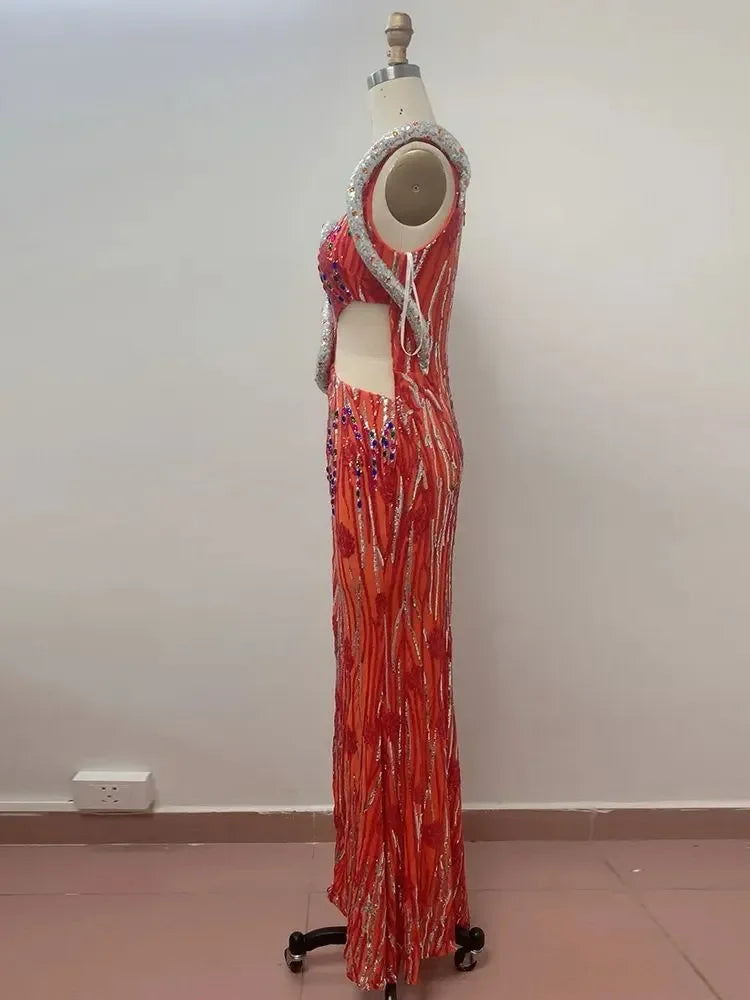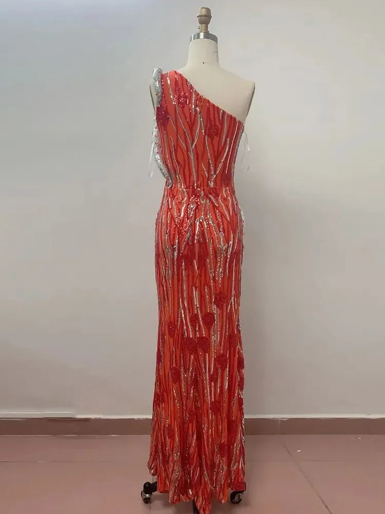 Luxury Diamond One Shoulder Mesh Sequin Orange Maxi Long Dress Elegant Party Evening Dress Vestido