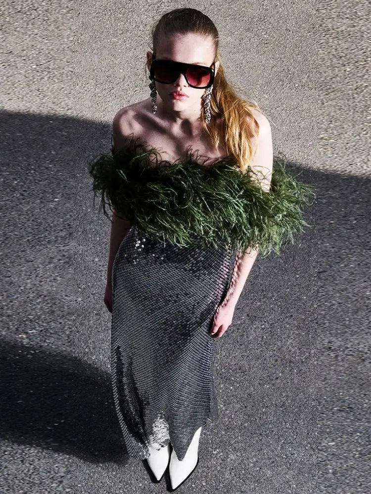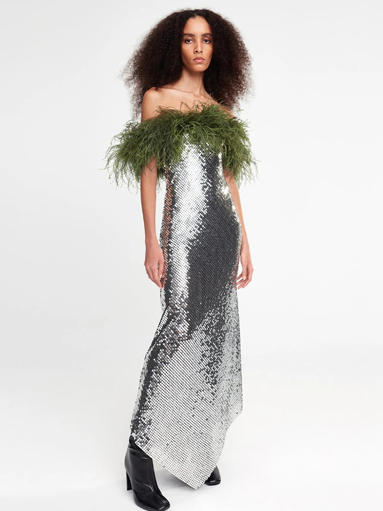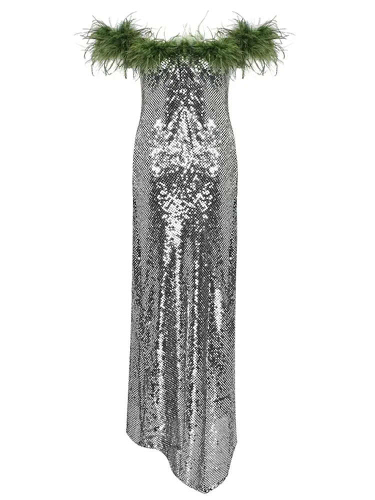 Sparkling Silver Sequins Luxury Dress Elegant Feather Off Shoulder Irregular Long Party Dress Robe