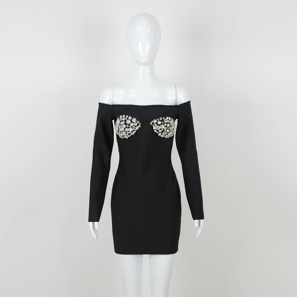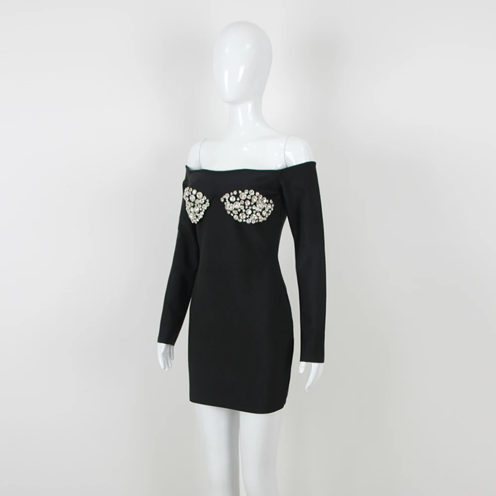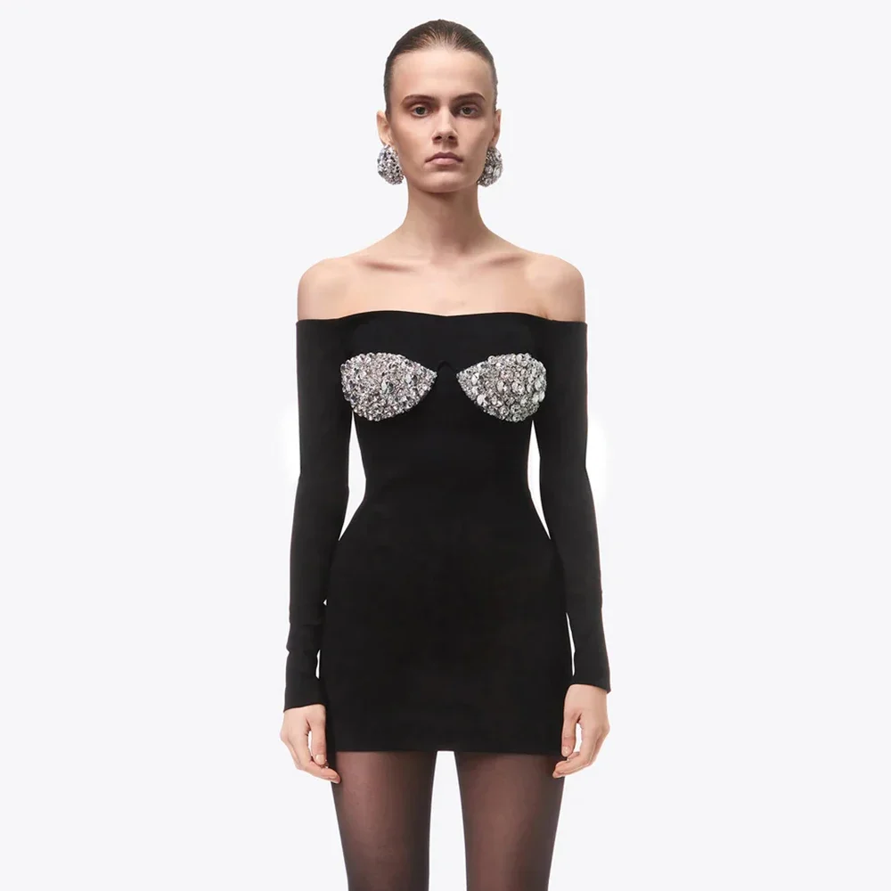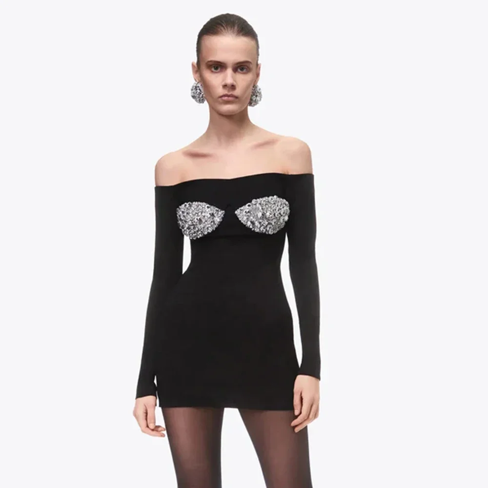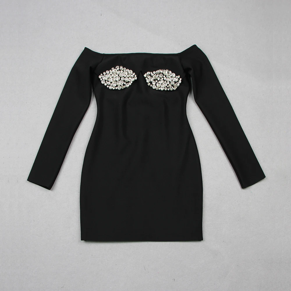 New Luxury Beaded Diamond Off Shoulder Long Sleeve Party Dress Bodycon Bandage Black Mini Dress