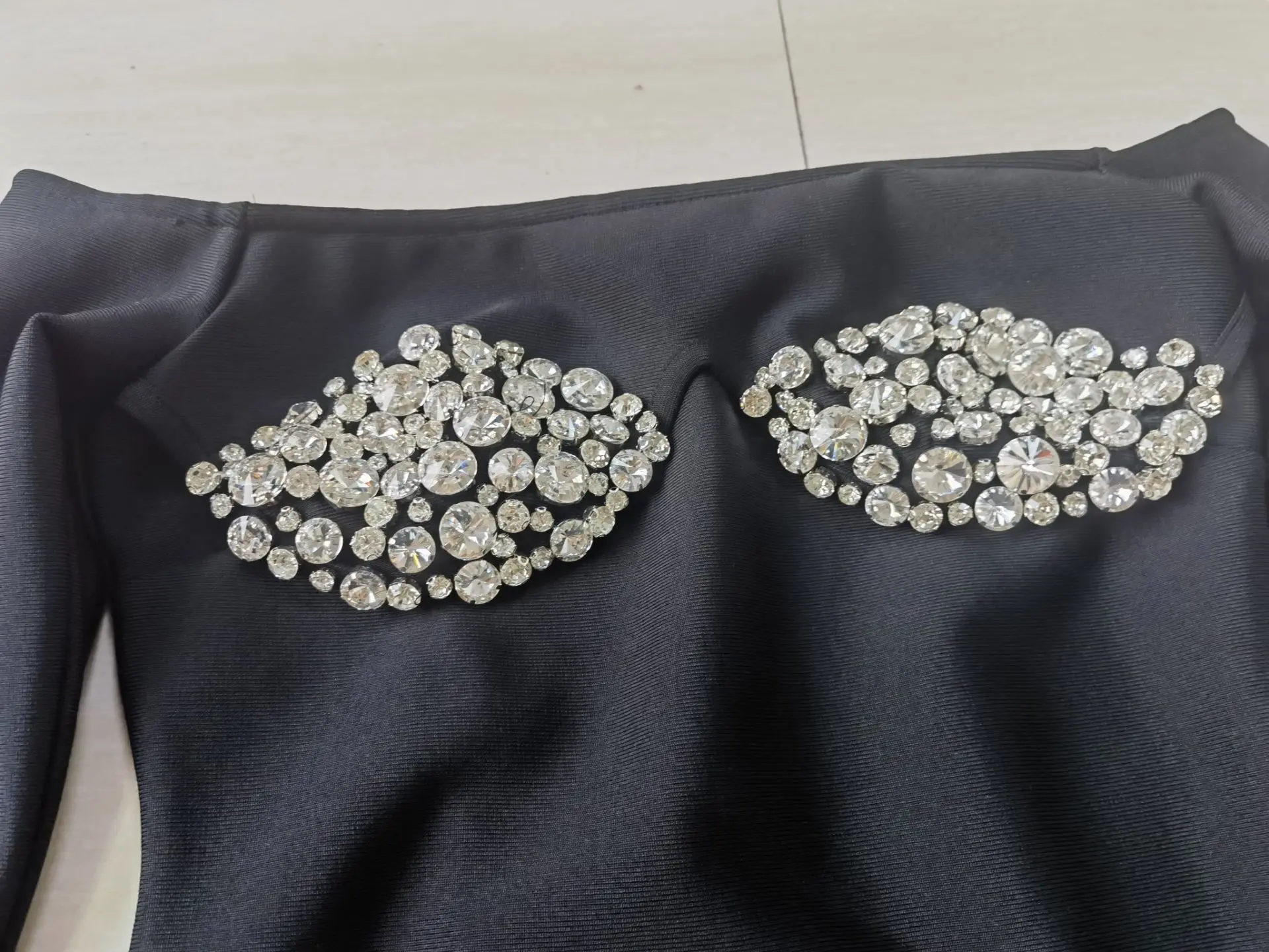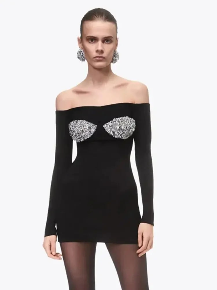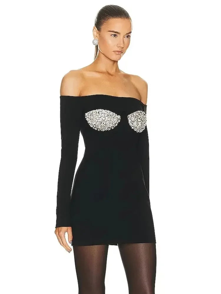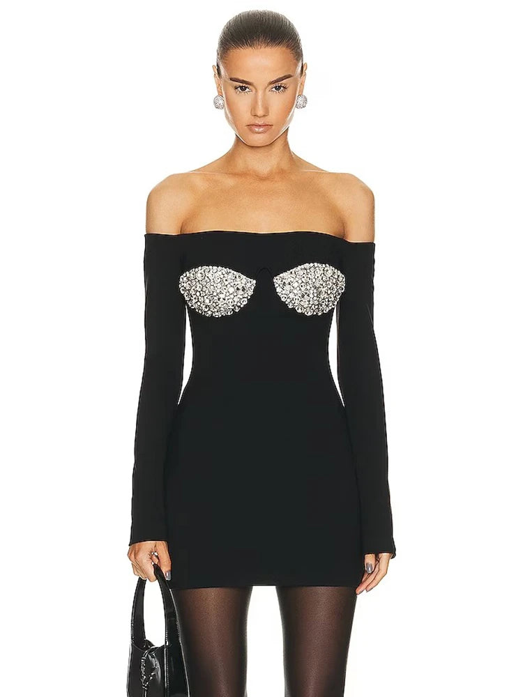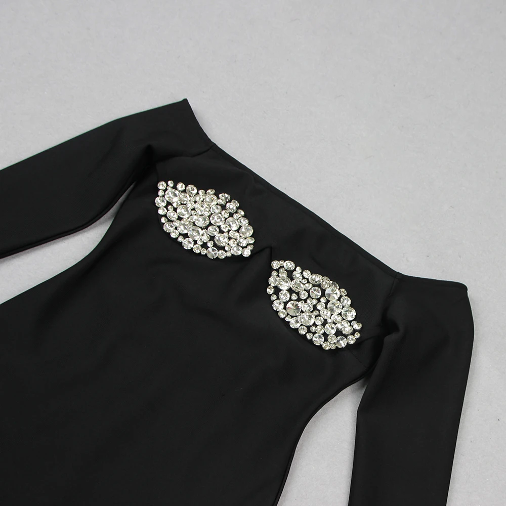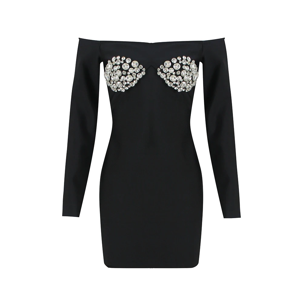 New Luxury Beaded Diamond Off Shoulder Long Sleeve Party Dress Bodycon Bandage Black Mini Dress
