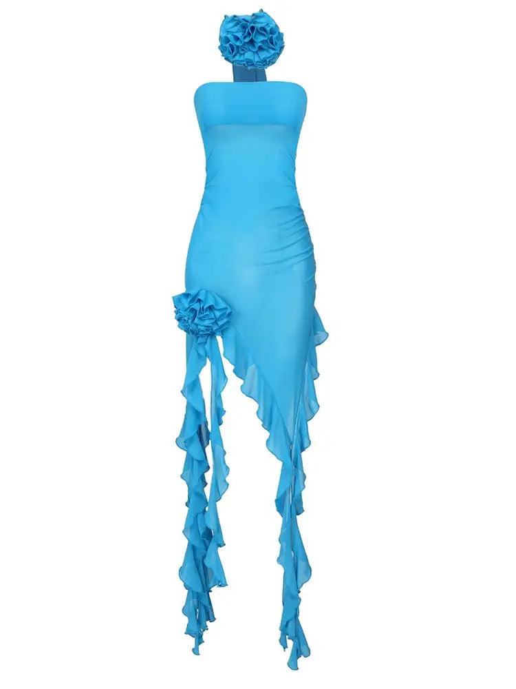 New Women's Strapless Transparent Mesh Bodycon Beach Party Club Irregular Ruffled Flower Sleeveless Dress