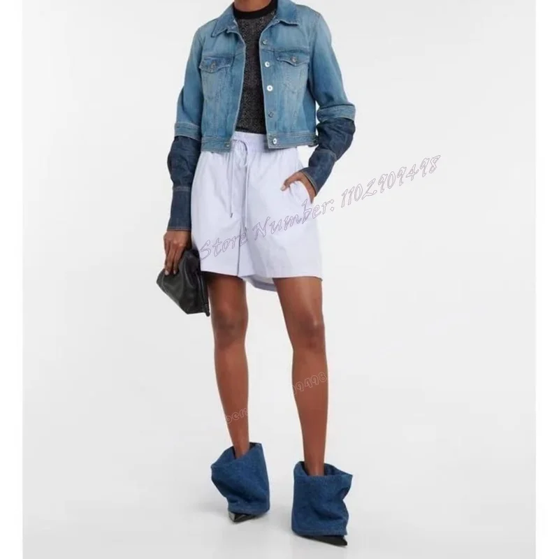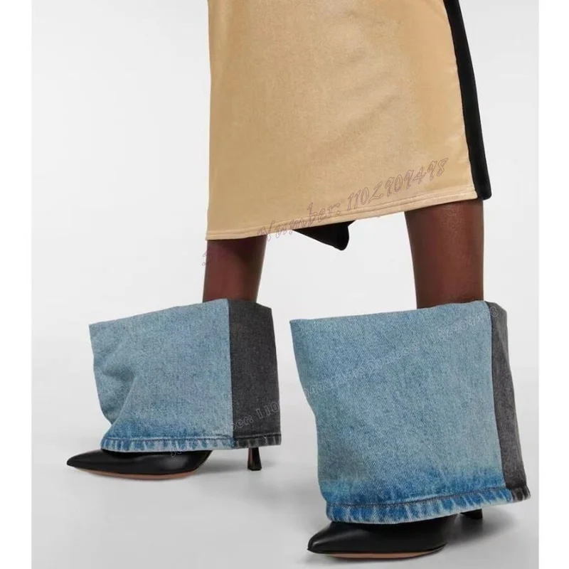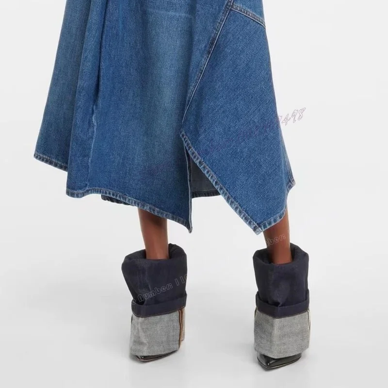 Blue Denim Patchwork Mid Calf Boots Pointed Toe Shoes