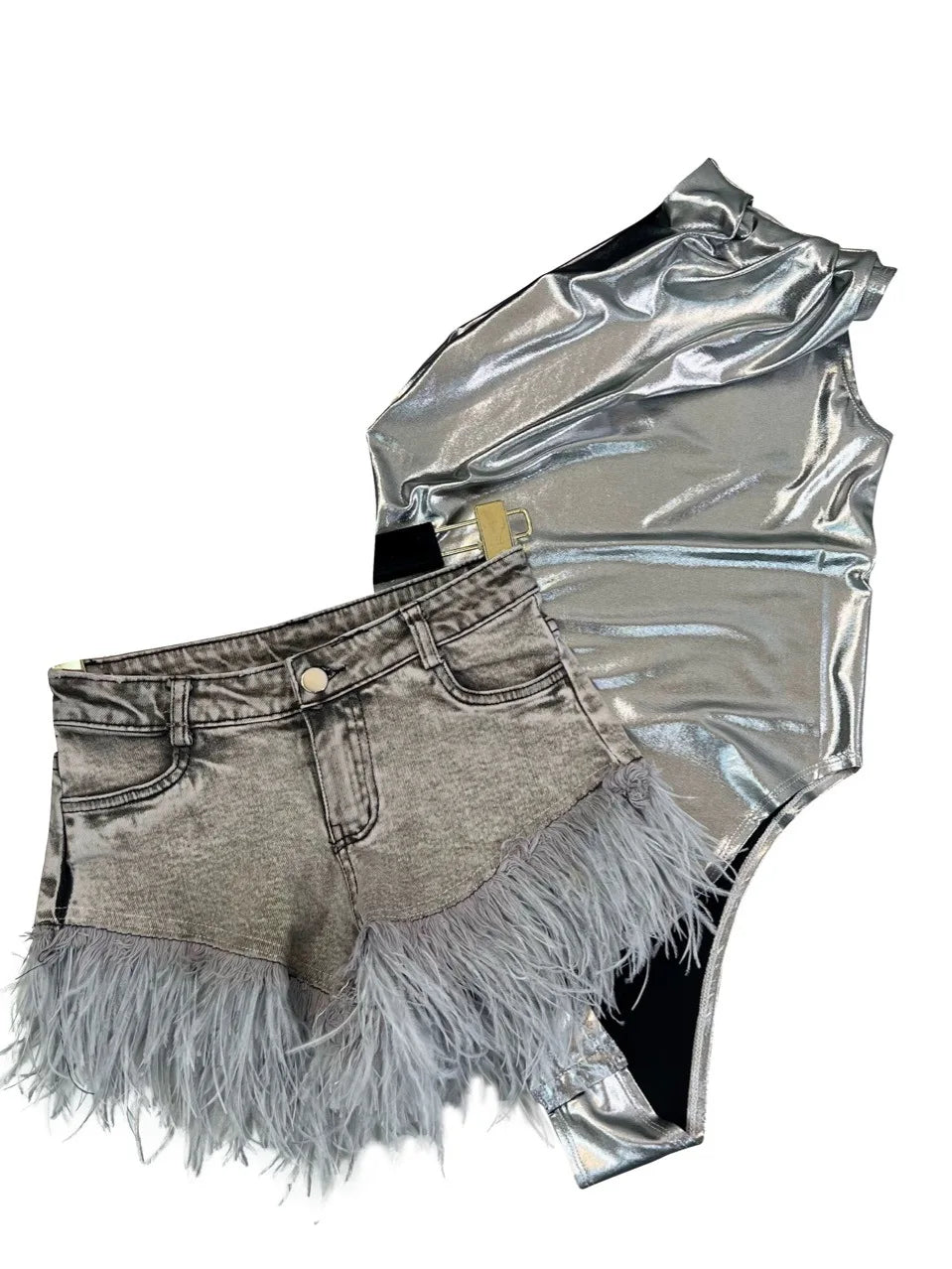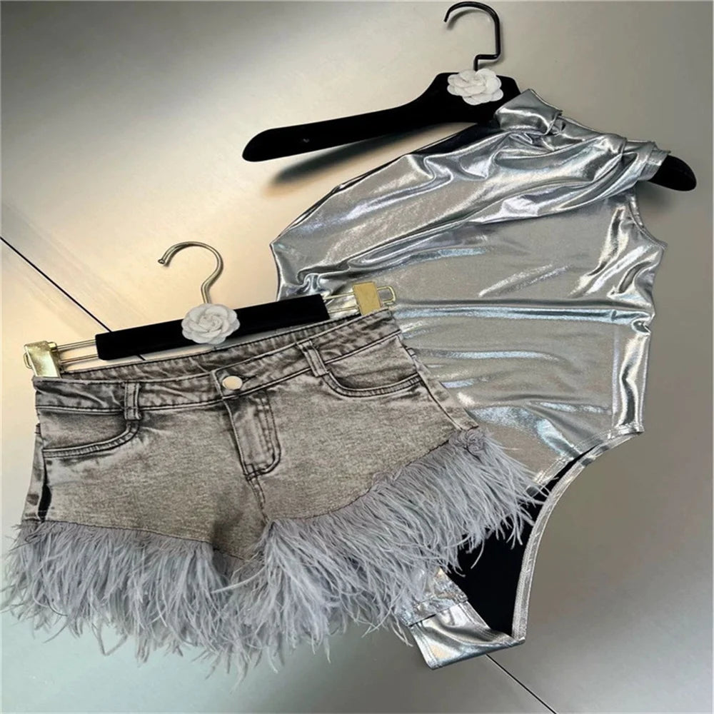 Design Summer Slanted Shoulder Sleeveless Metal Tank Top Feather Tassel Denim Shorts Set