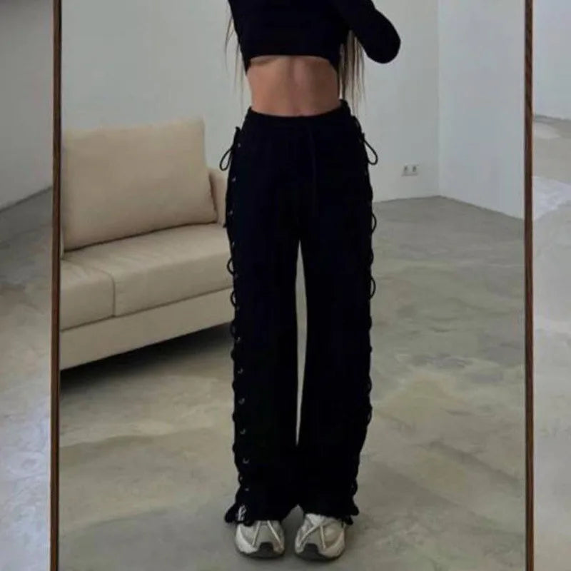 Y2K Grunge Casual Baggy Long Pants Solid Color Drawstring Waist Side Hollow Out
