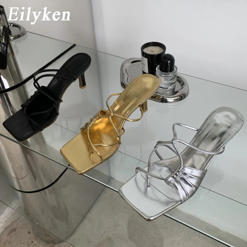Gold Narrow Band Women Slipper Female Square Pinch Toe Low Heel Slides Sandal Flip Flops Mujer Shoes