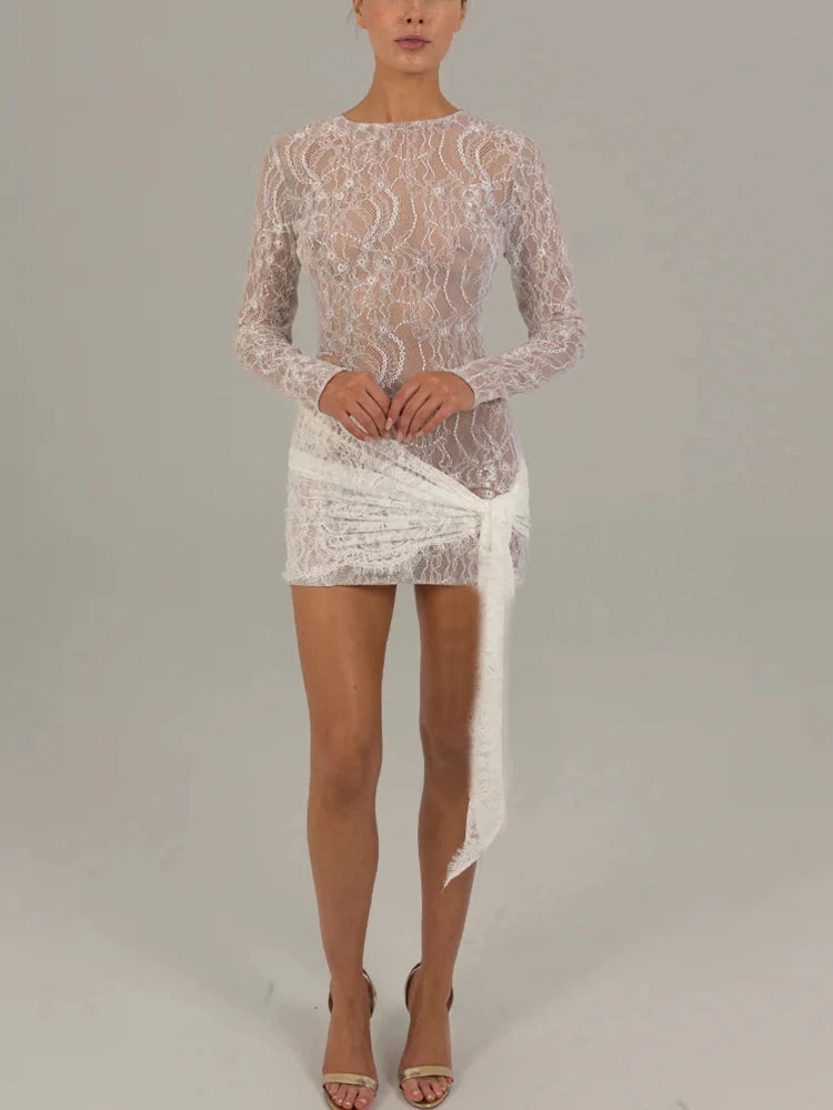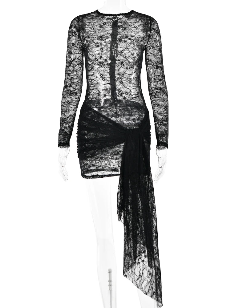 Lace Bandage Women Dress Black Long Sleeve Round Neck Ruched Dress