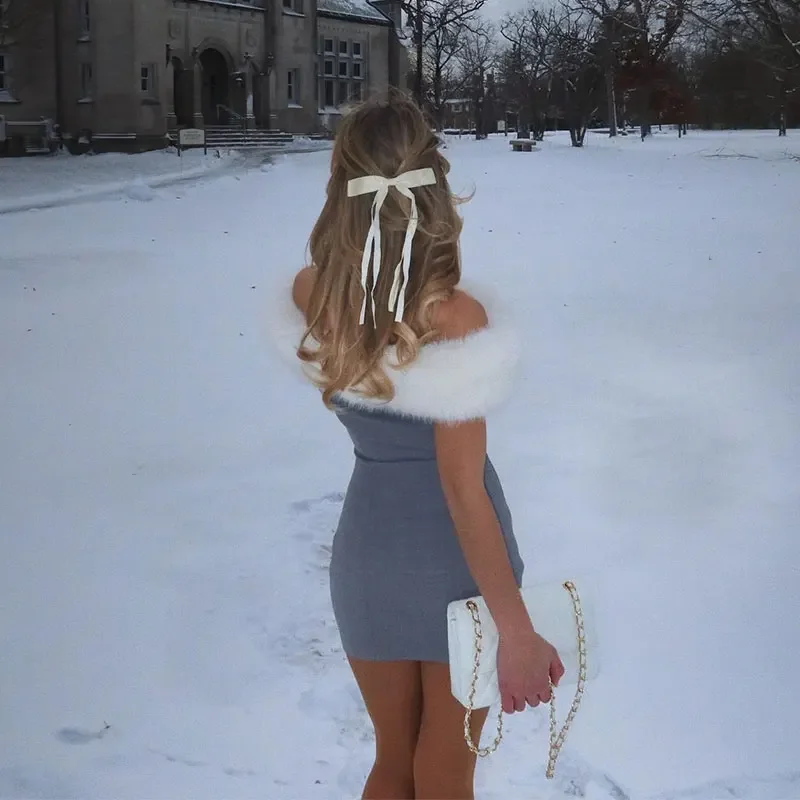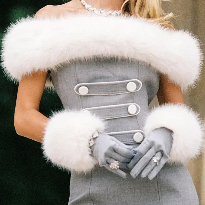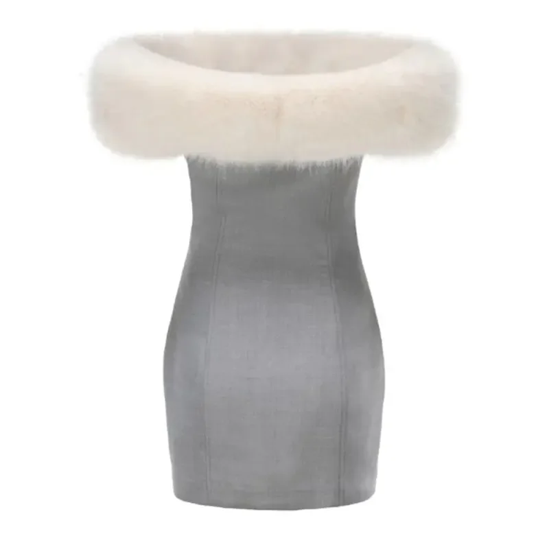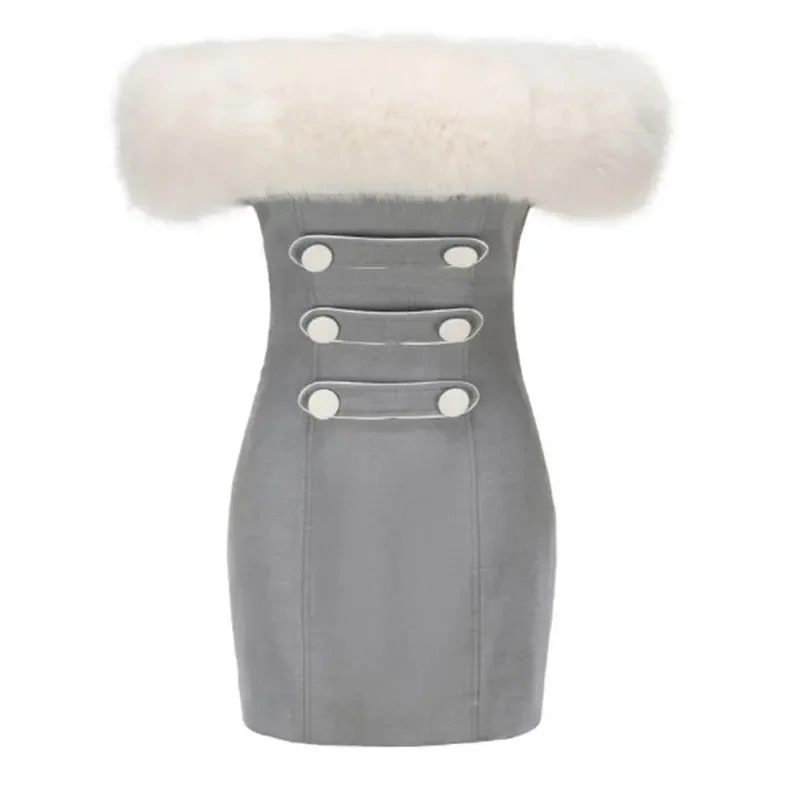 Fur Collar Off Shoulder Patchwork Dress Elegant Buttons Sleeveless Slim Mini Dresses Spring Party Commute Vestidos