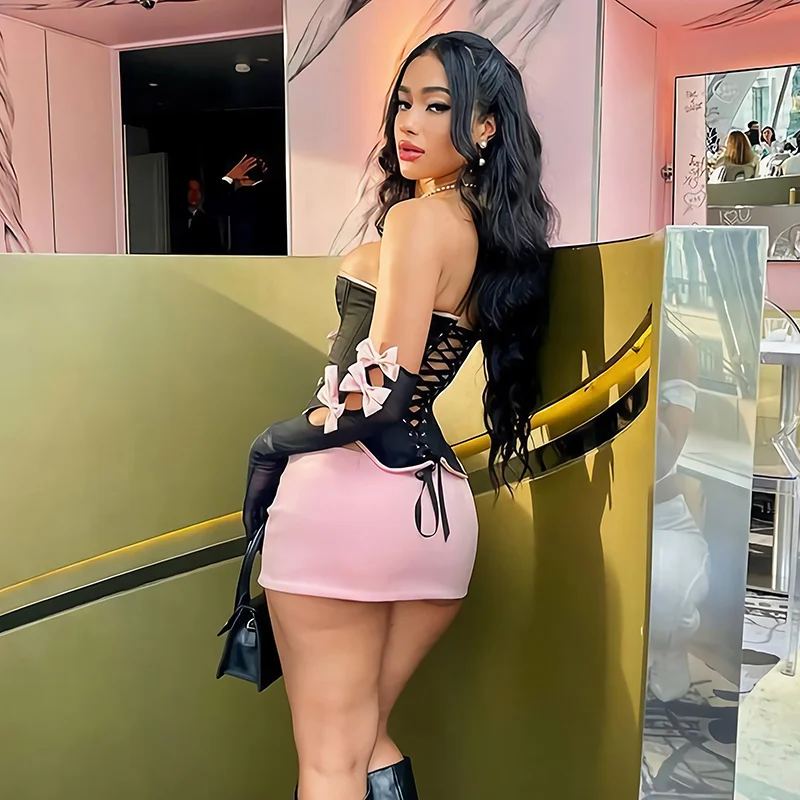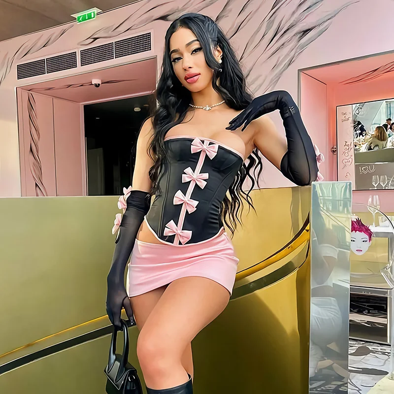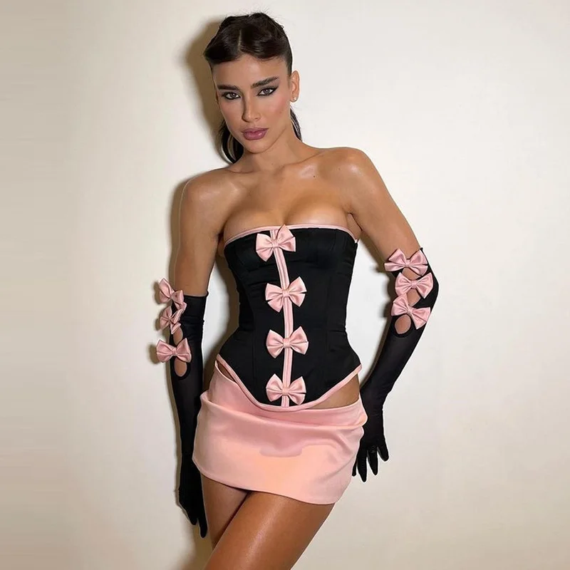 Two Piece Set Y2K Suit Bows Trim Strapless Corset Tops Mini Skirt