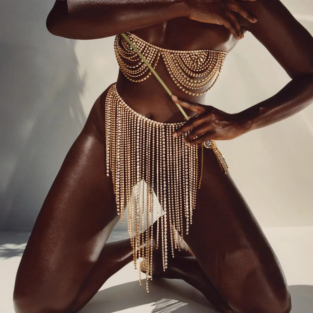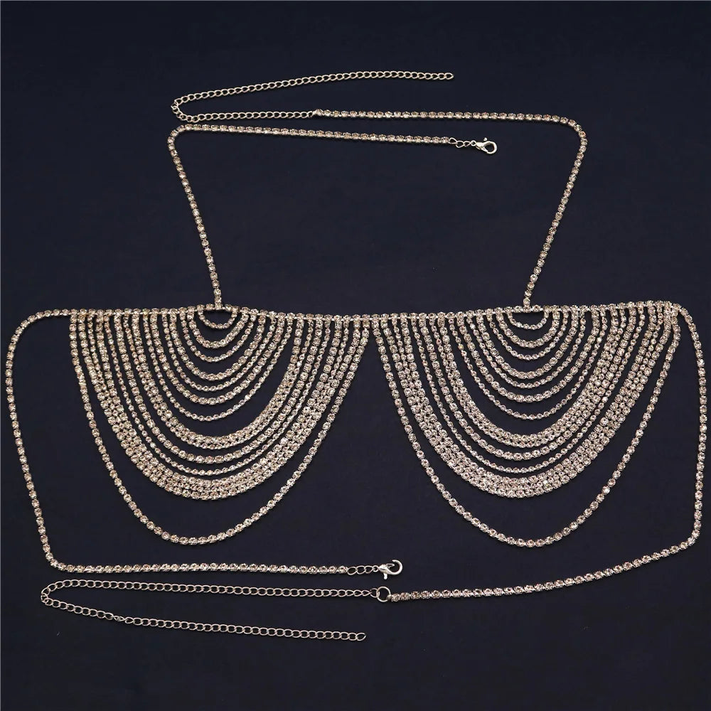 Luxury Multilayer Fringe Bra Body Chain Dress With Rhinestones
