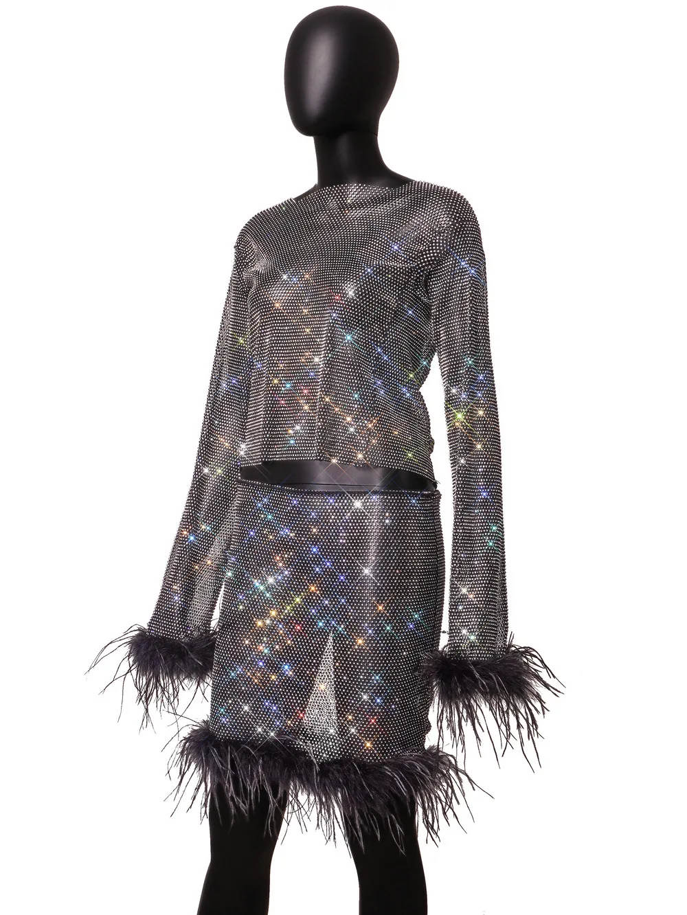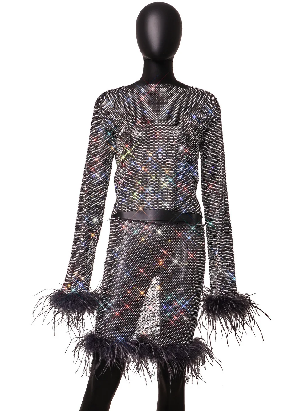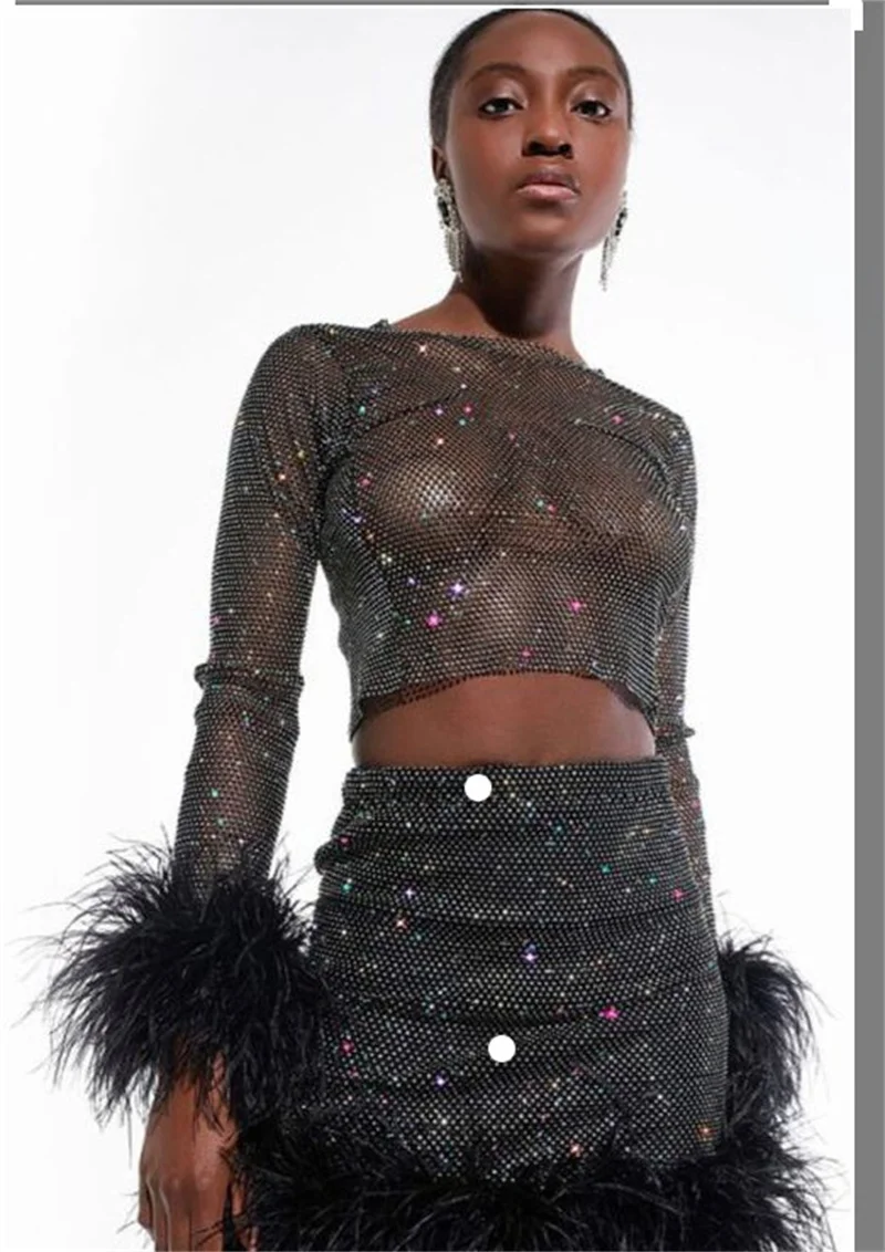 New Flash Diamond Mesh Cutout Long Sleeve 2 Pieces Sets