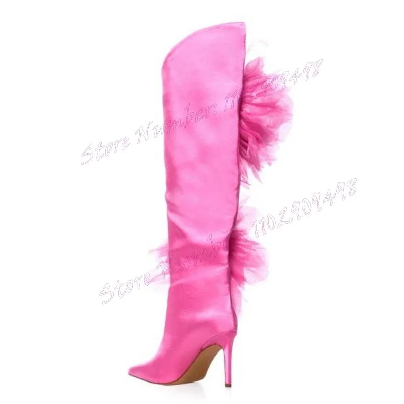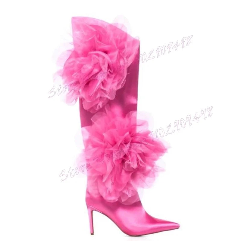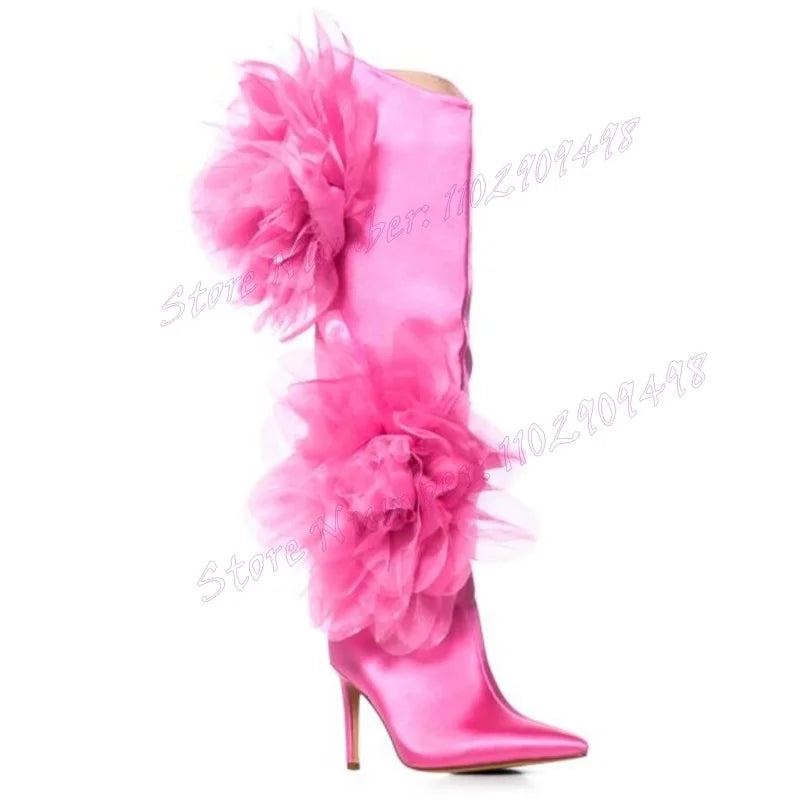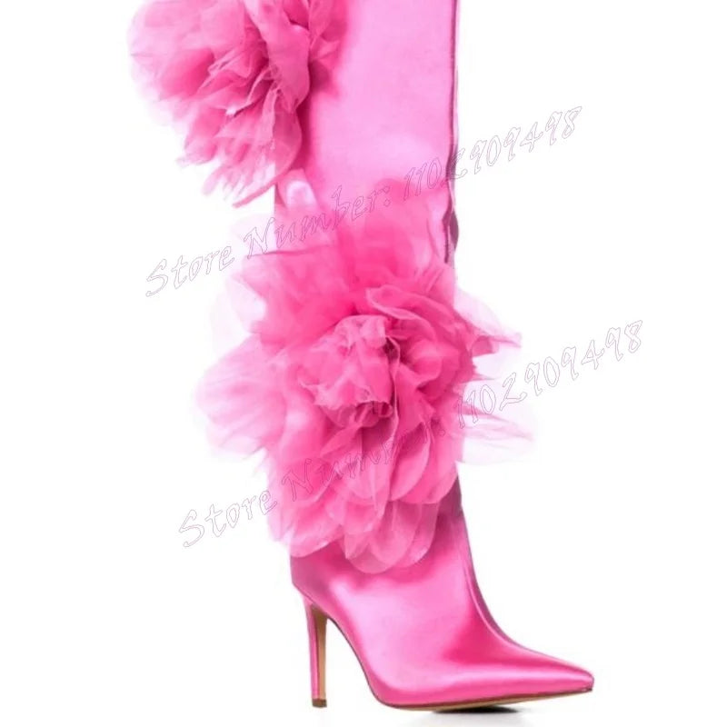 Pink Mesh Flower Decor Satin Boots Knee High Pointy Toe