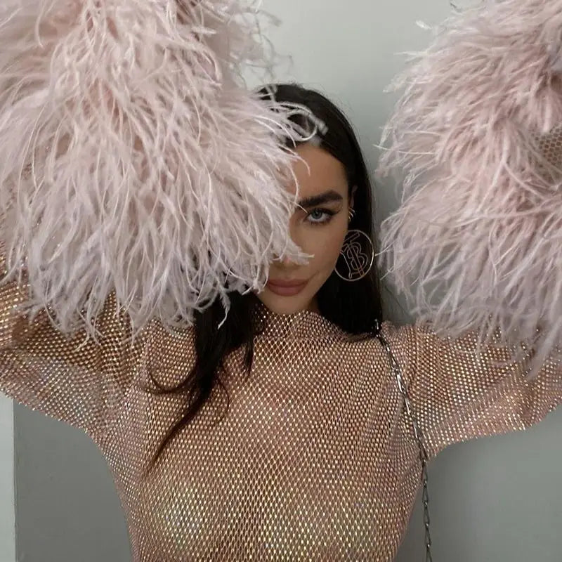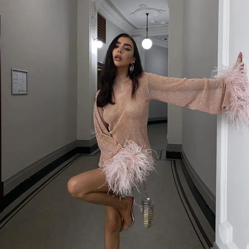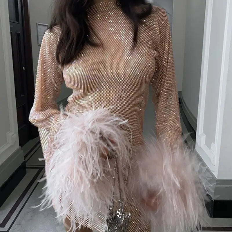 Round Neck Feather Top Long Sleeves Crystal Rhinestone Mesh Diamond Ostrich Feather Dress