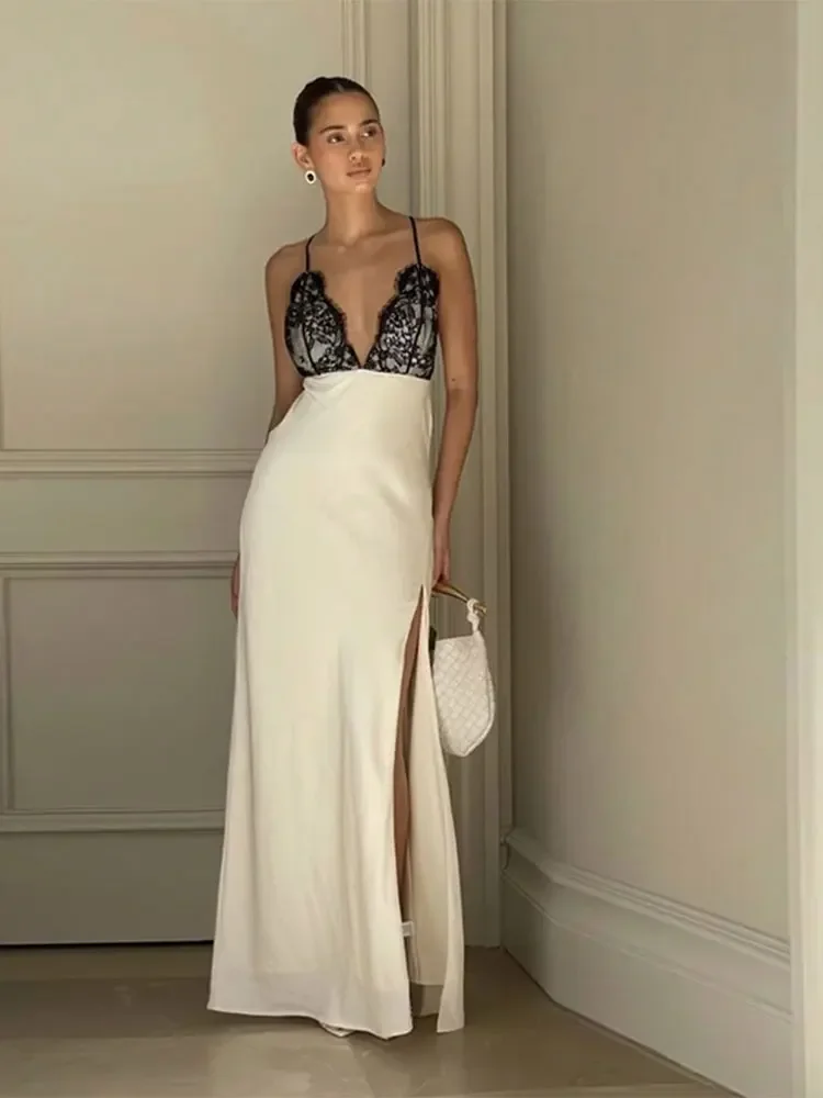 Lace Patchwork Sling Dress V Neck Backless Sling Dresses Vestidos