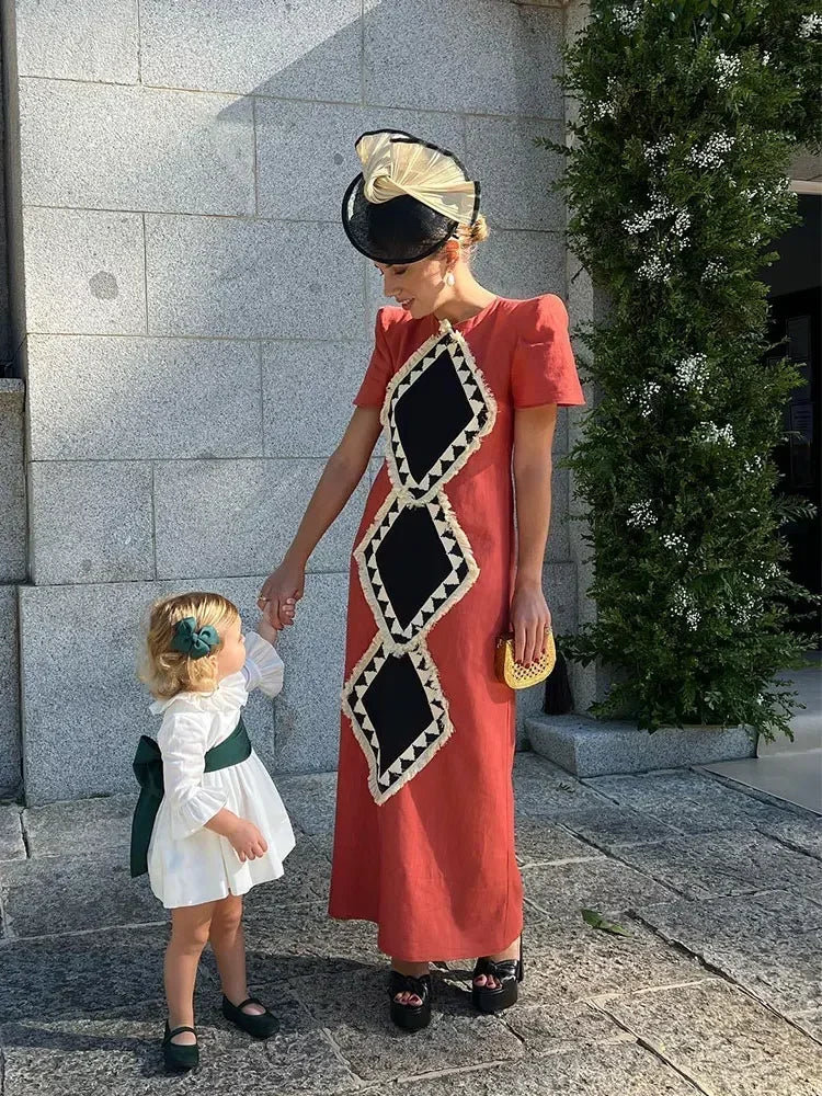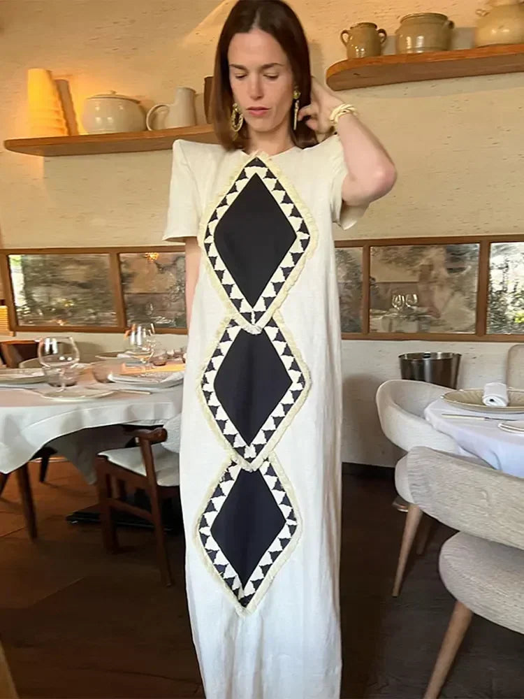 Short Sleeve Padded Printed Geometric Embroidery Vacation Dress