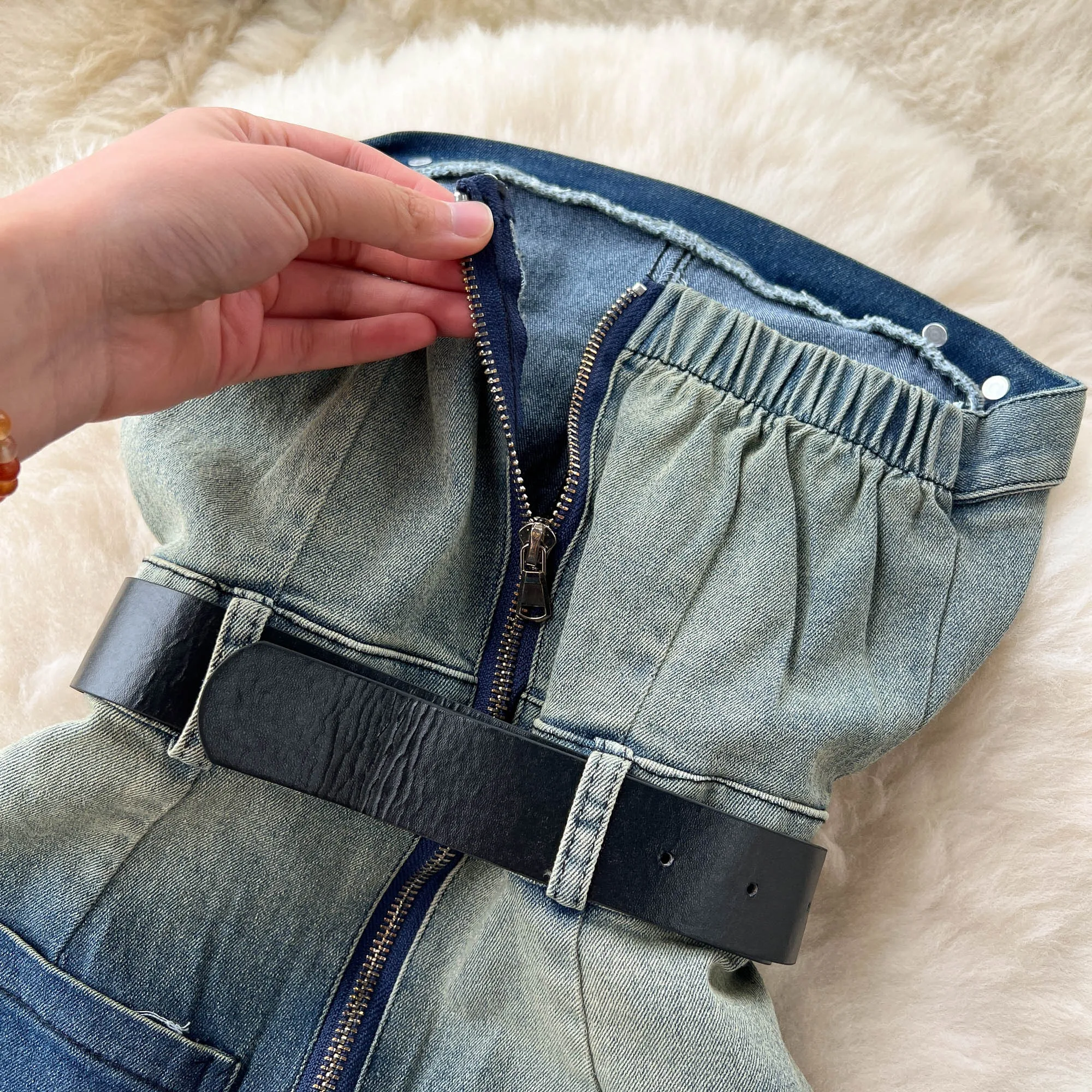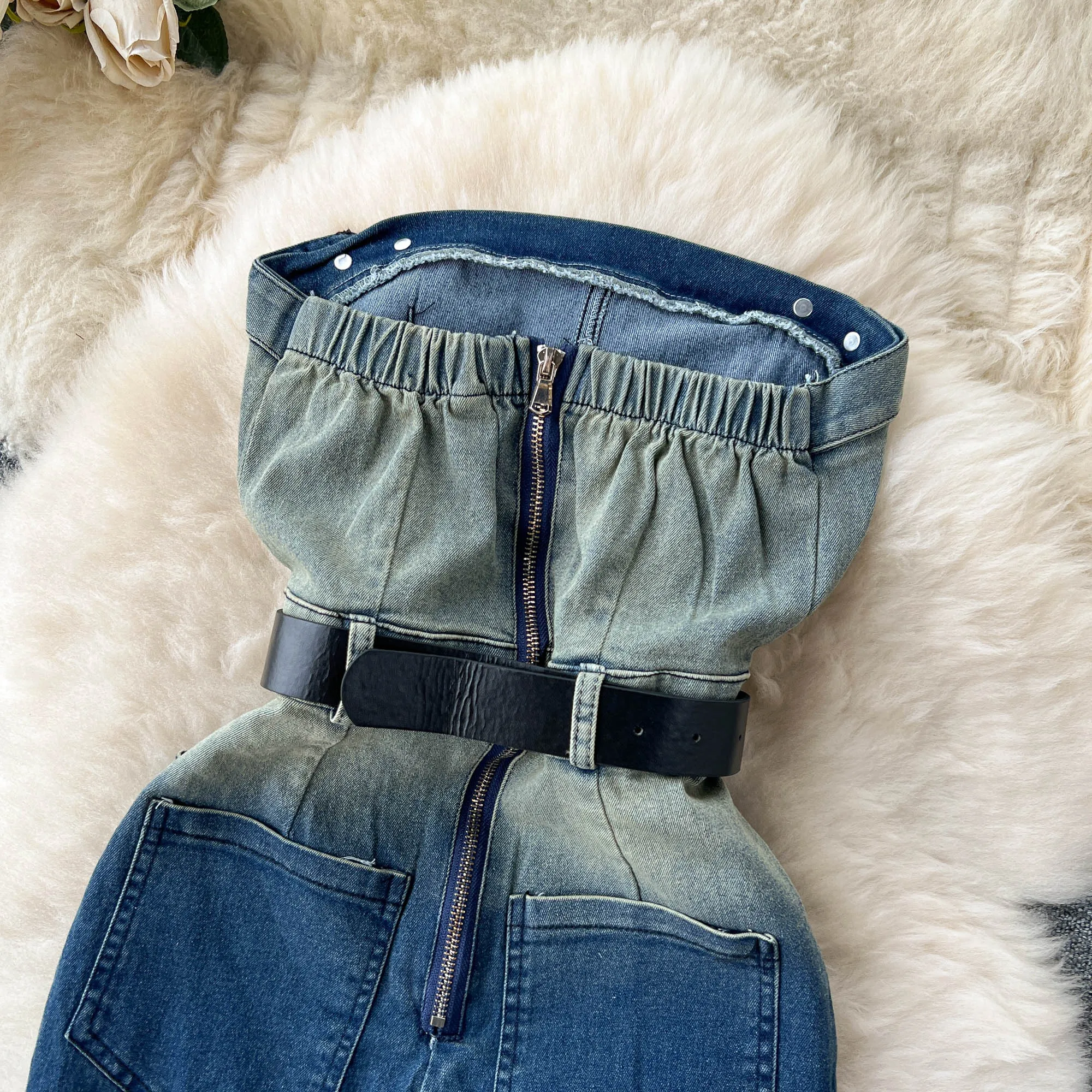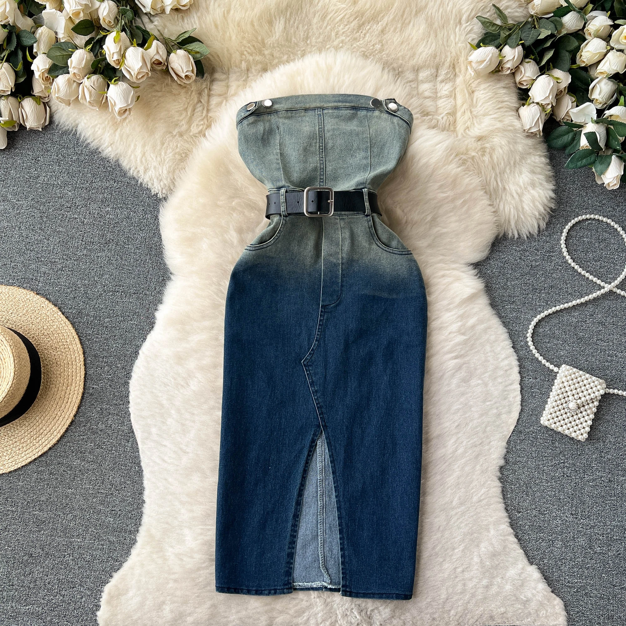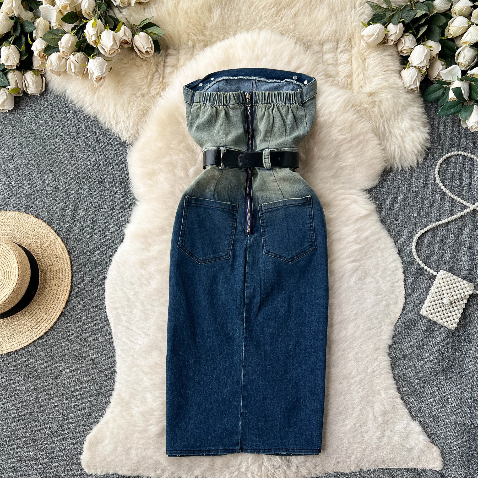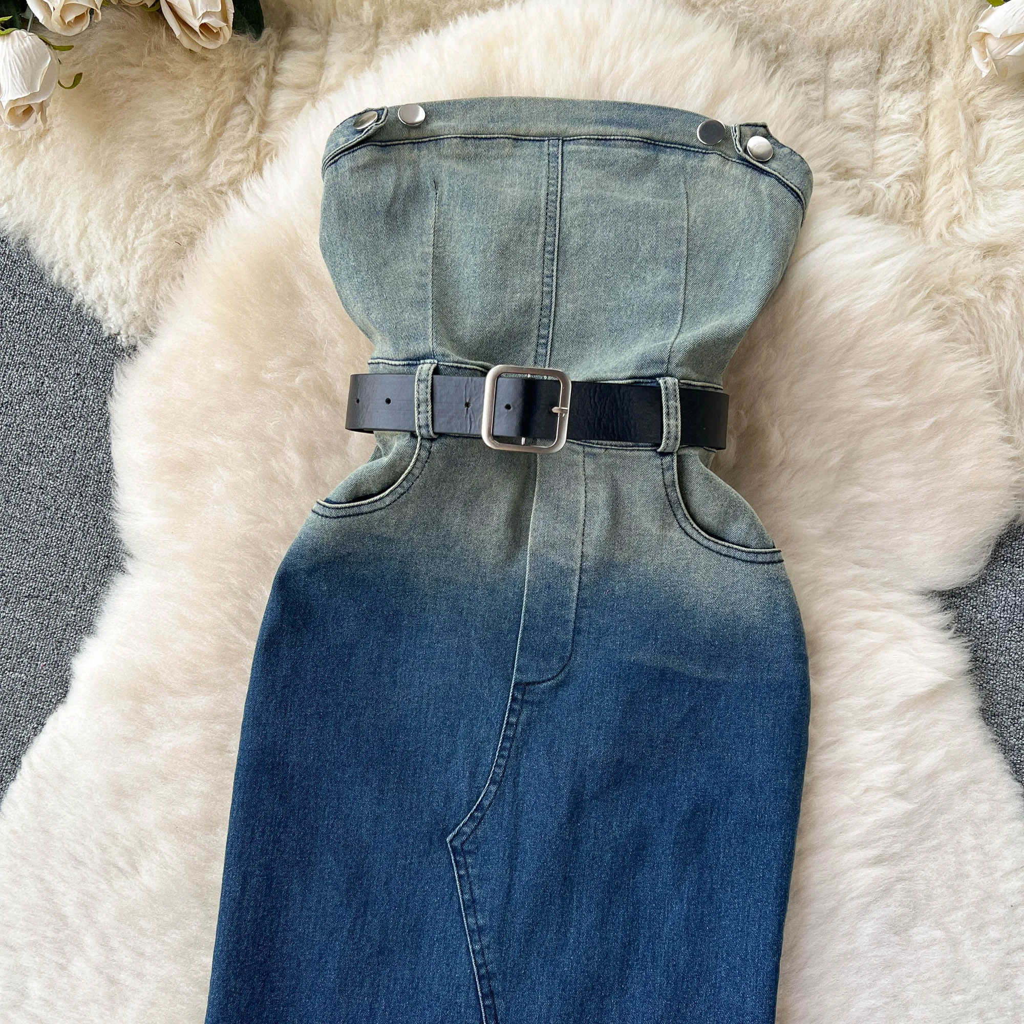 Denim Dress Strapless Gradient Backless Zipper Belt Pocket Split Slim Bodycon Jean Maxi Dress