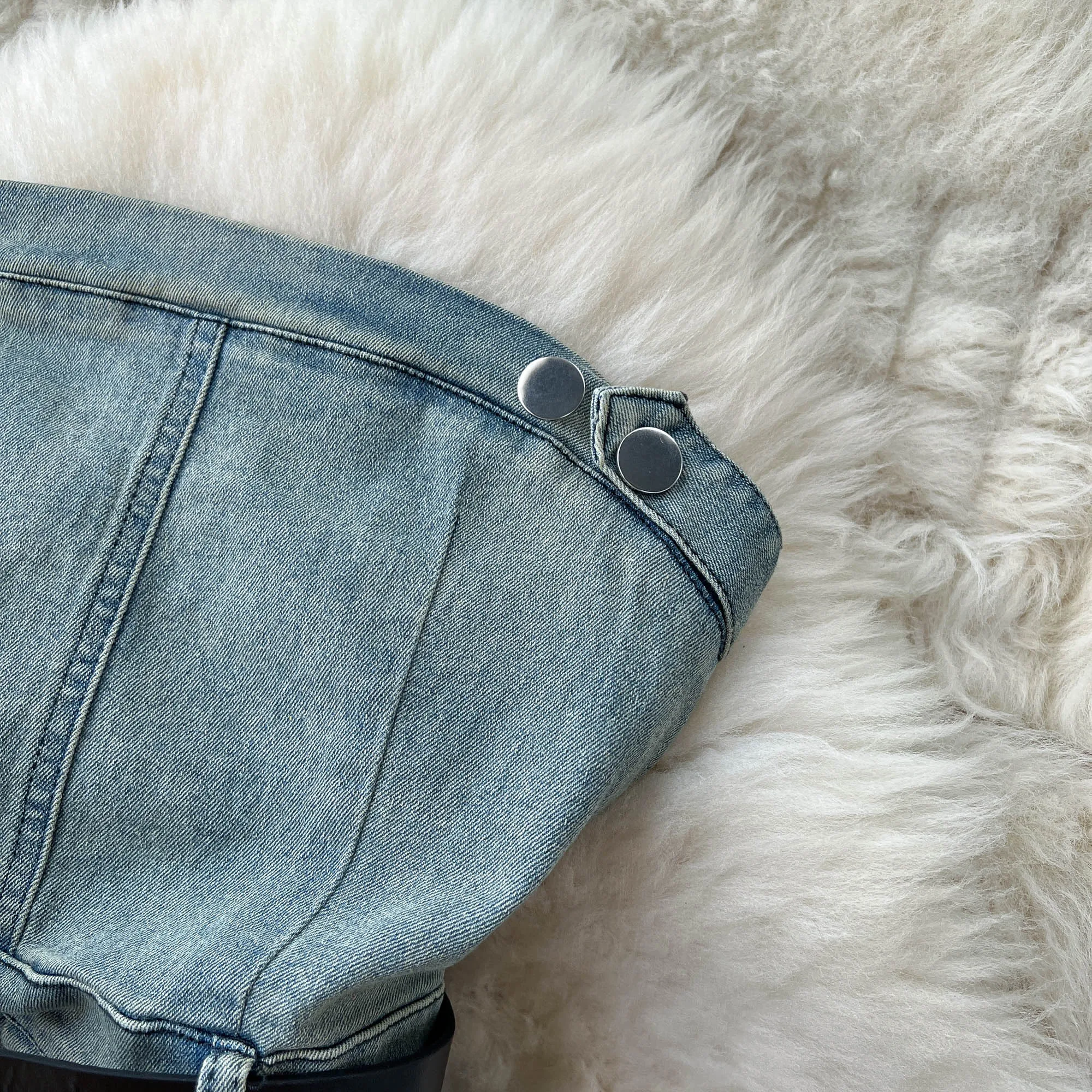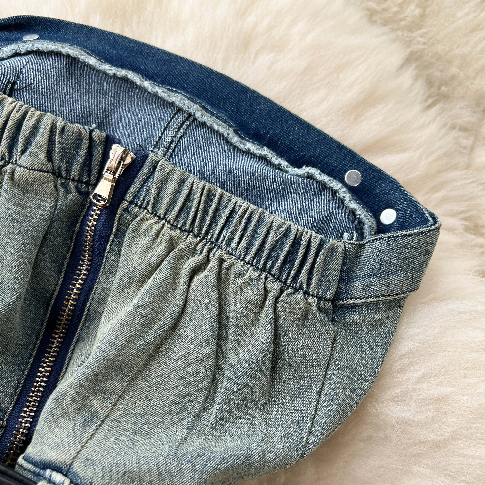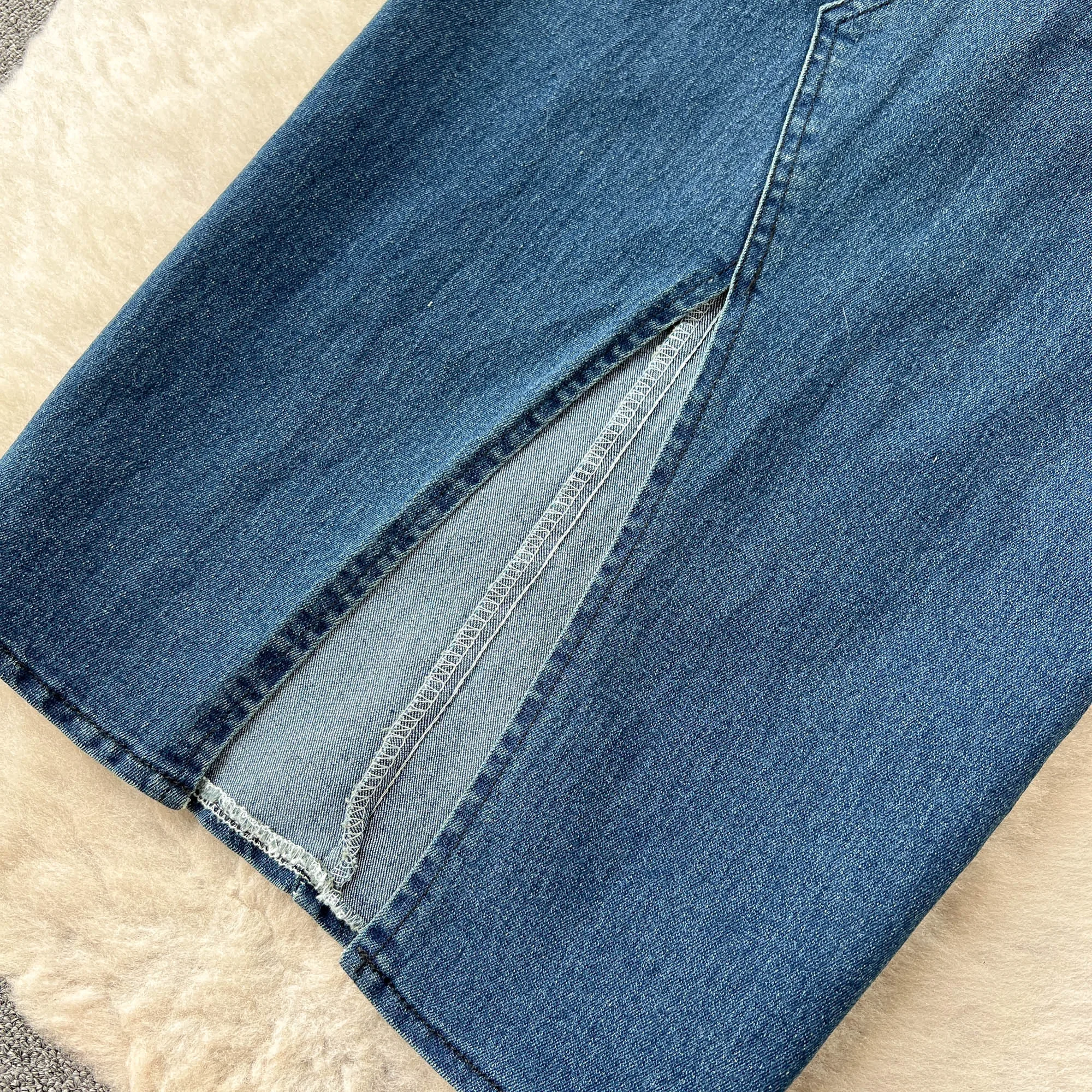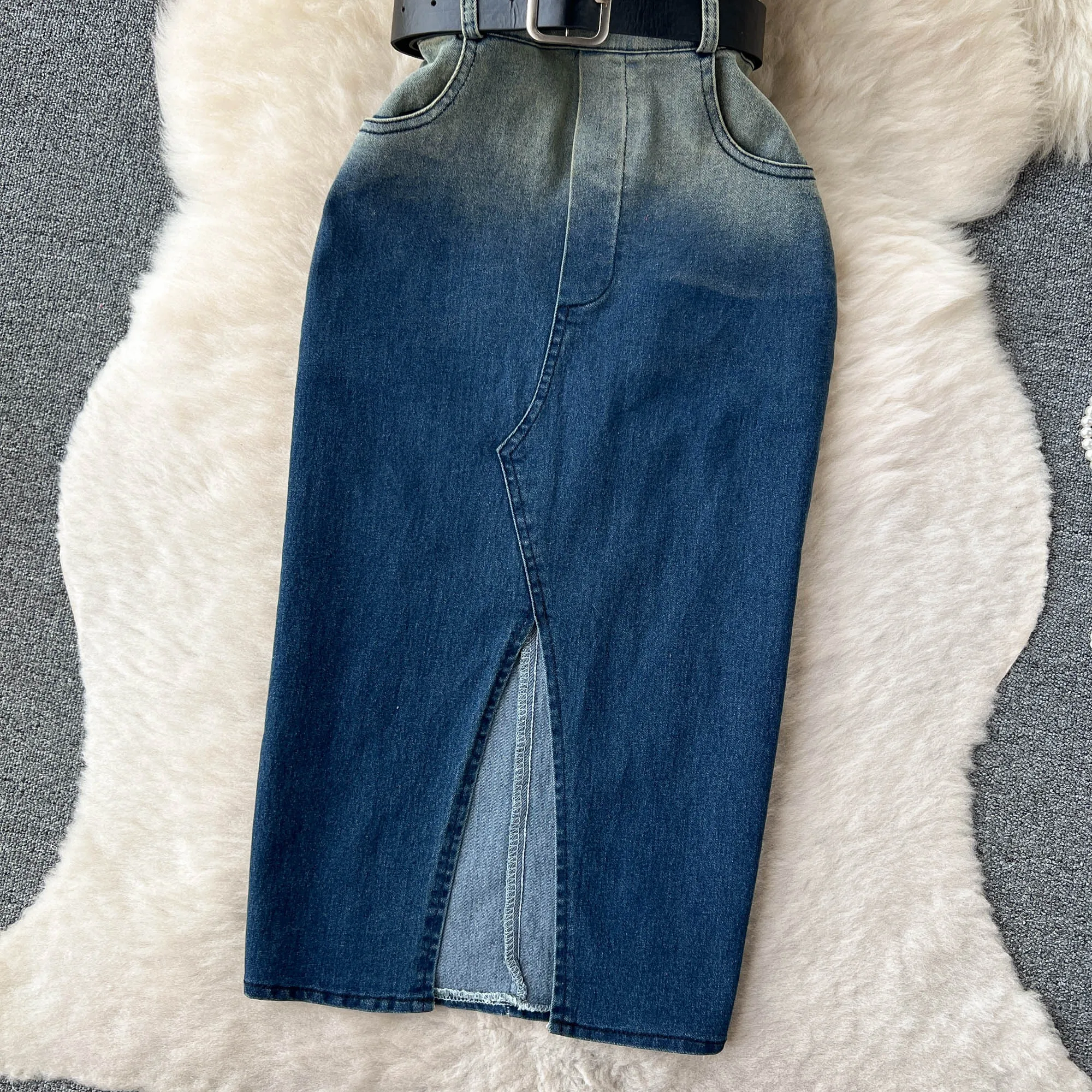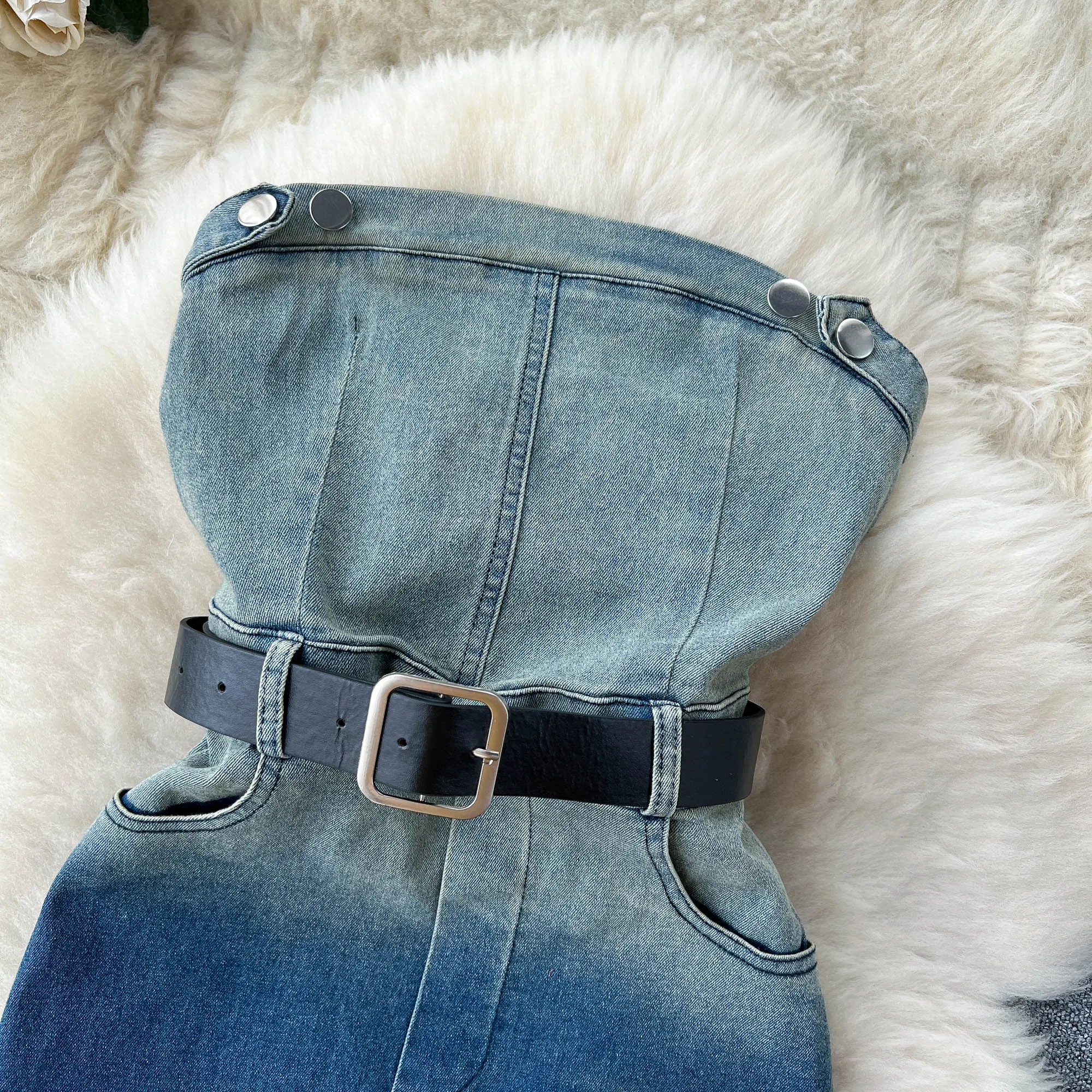 Denim Dress Strapless Gradient Backless Zipper Belt Pocket Split Slim Bodycon Jean Maxi Dress