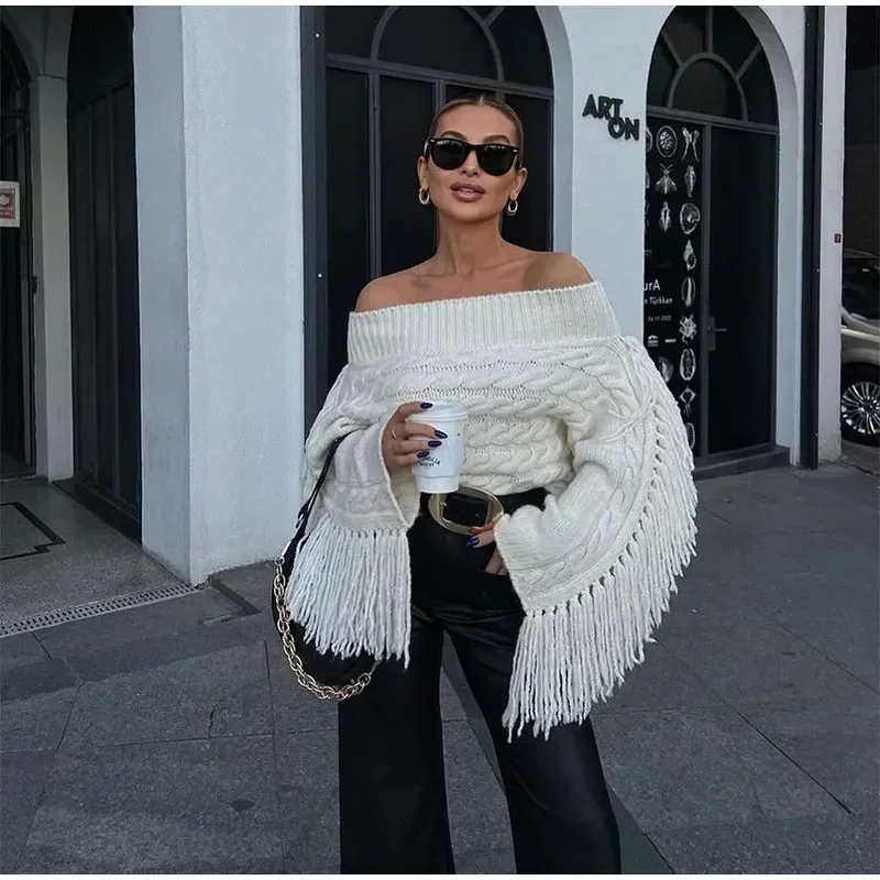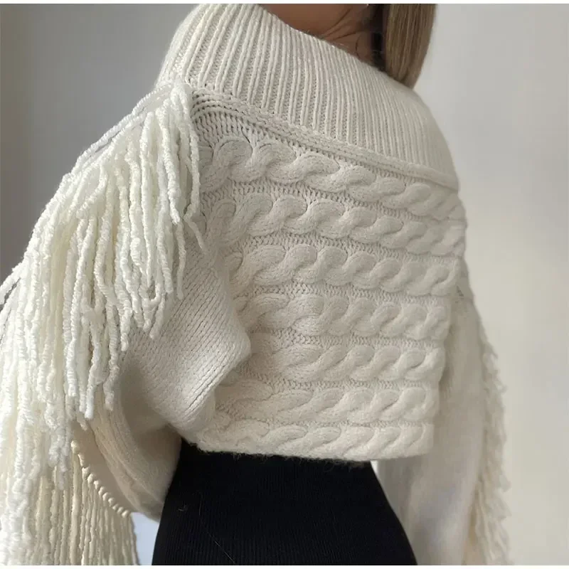 Solid Slash Neck Tassel Knit Pullover Thicken Sweater