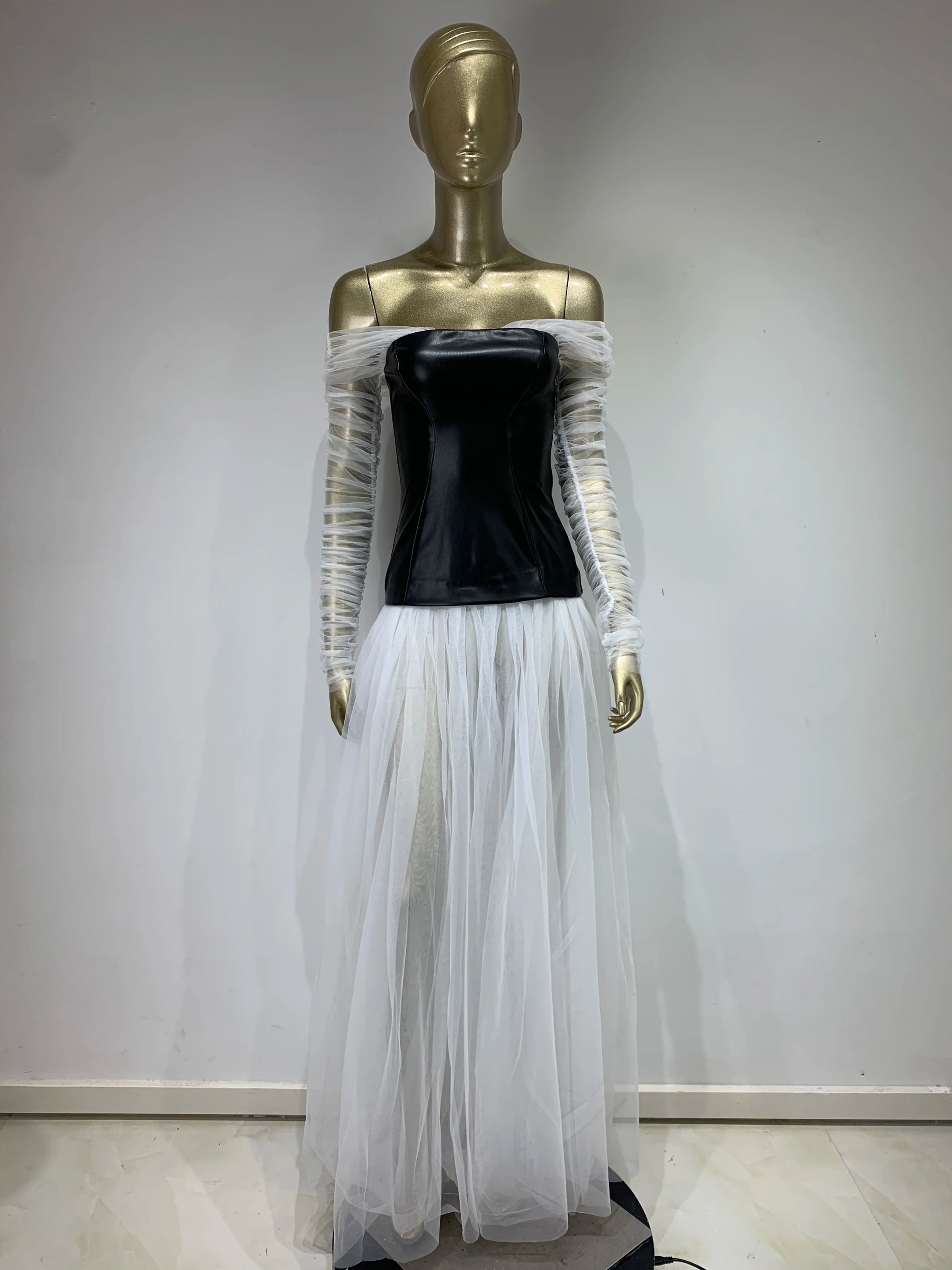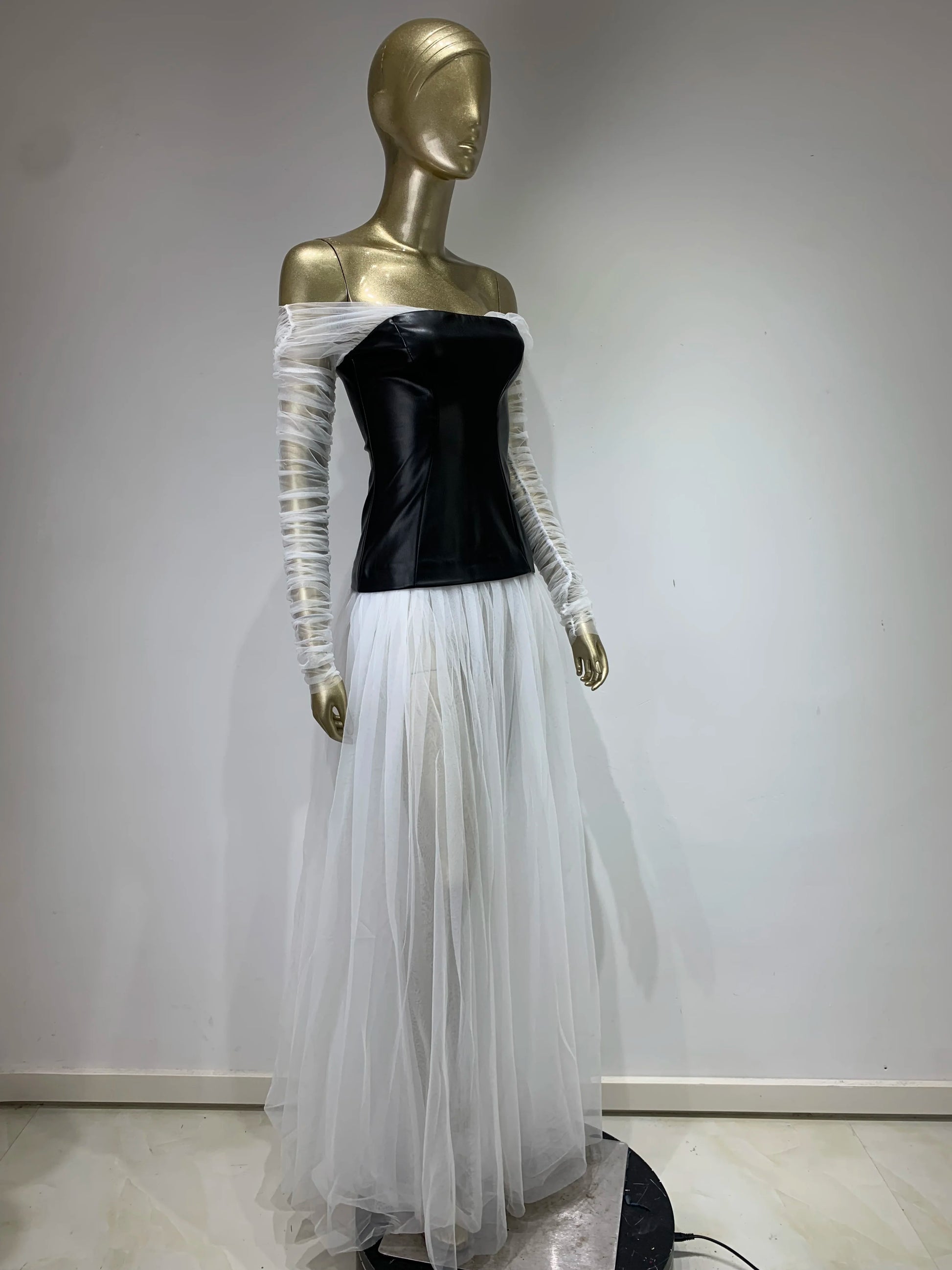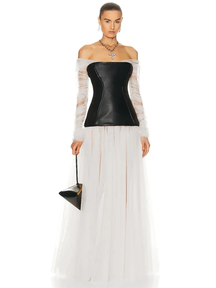 Luxury Off Shoulder Mesh Leather Patchwork Pleated Maxi Long Gowns Dress
