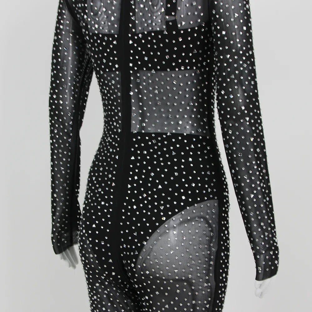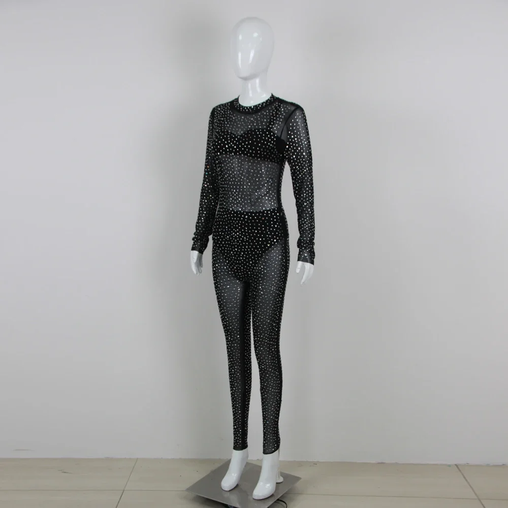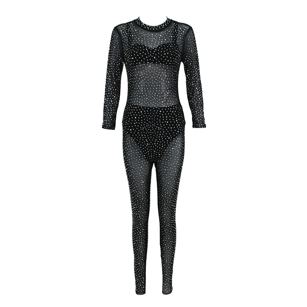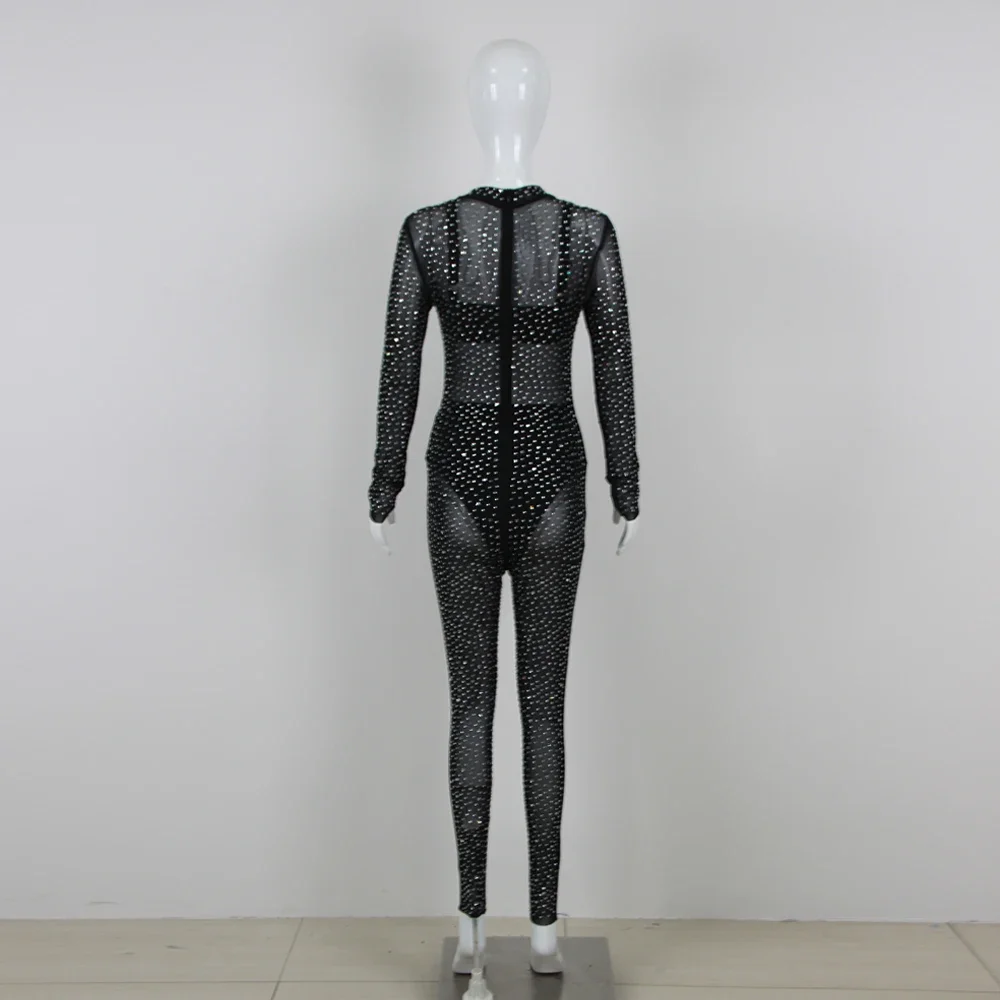 Rhinestone Mesh See Though Black Bodycon Jumpsuit Designer
