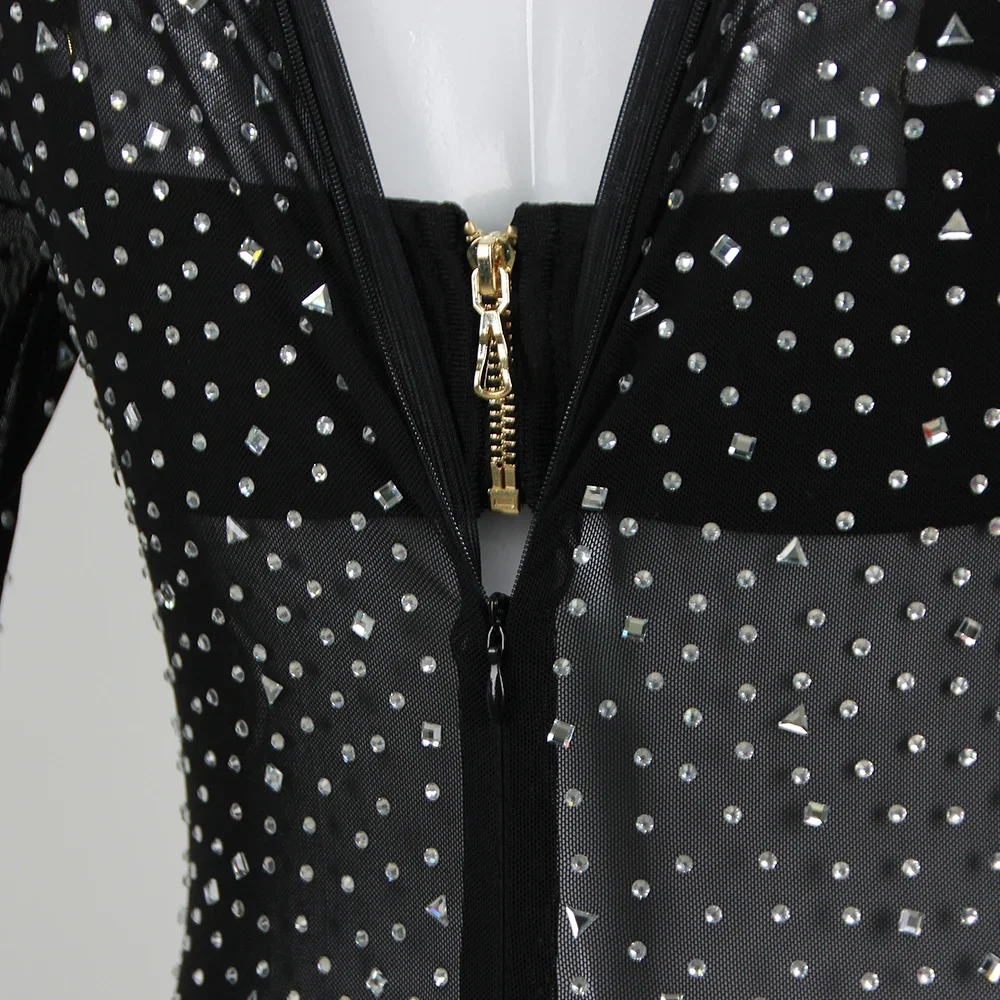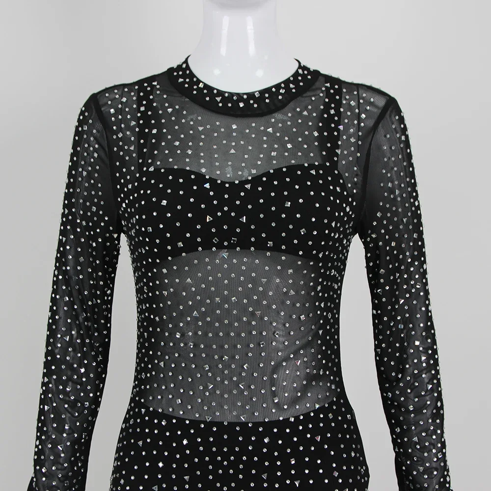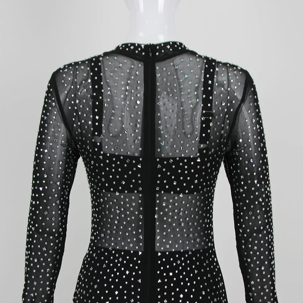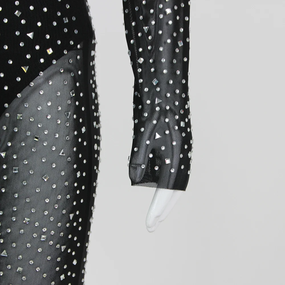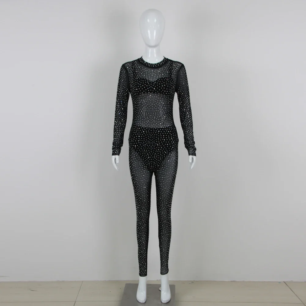 Rhinestone Mesh See Though Black Bodycon Jumpsuit Designer