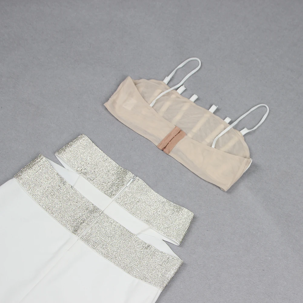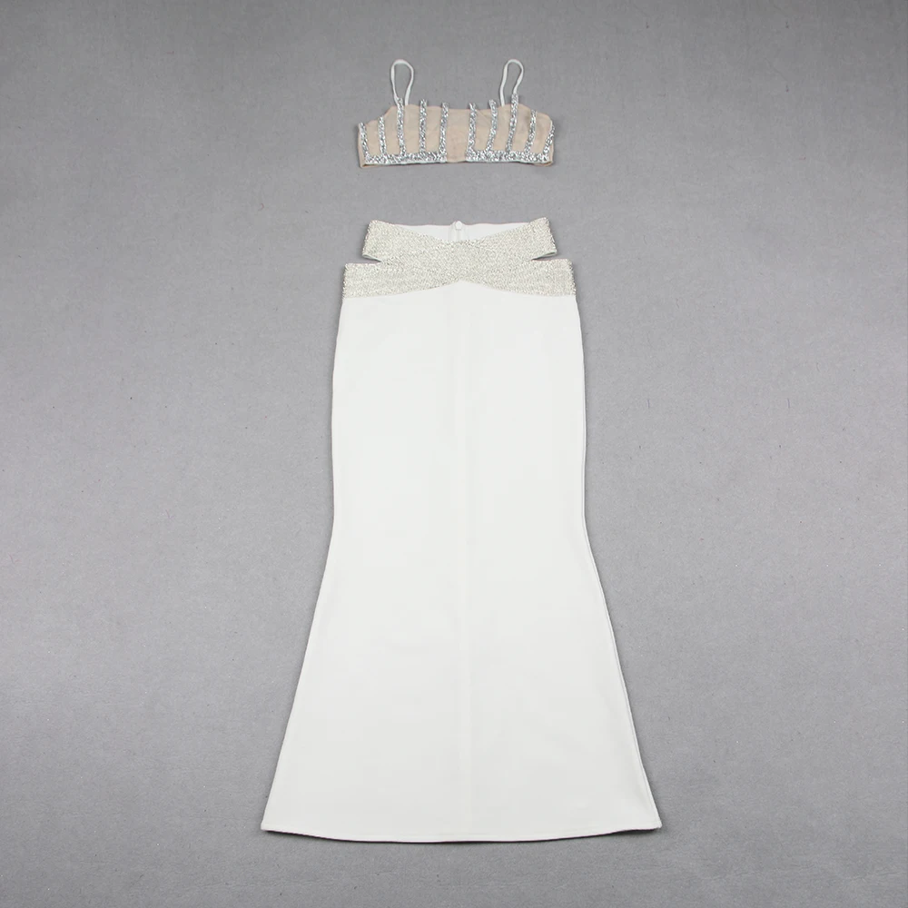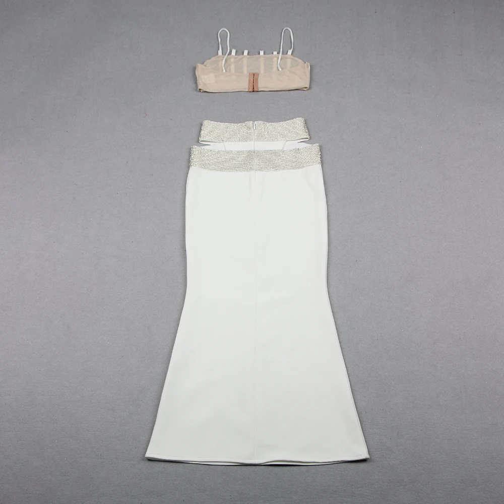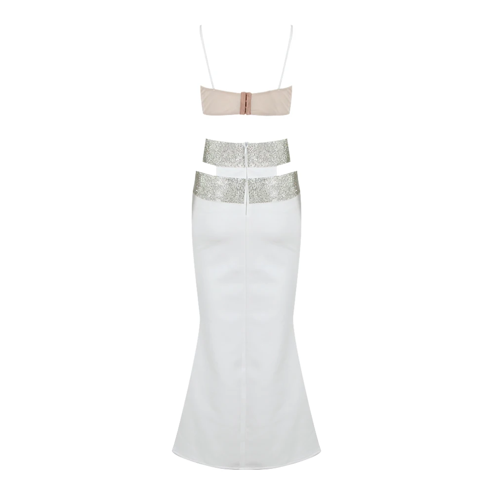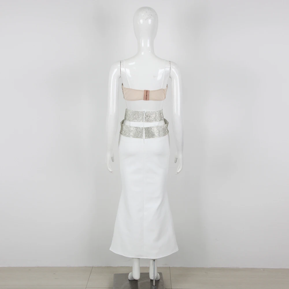 Backless Halter Diamonds Flower White Midi Bandage Skirt Set Knitted Elegant Evening Club Party Dress