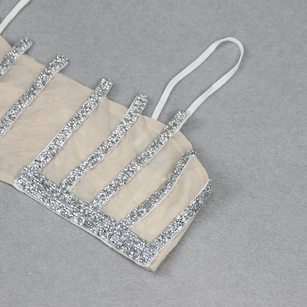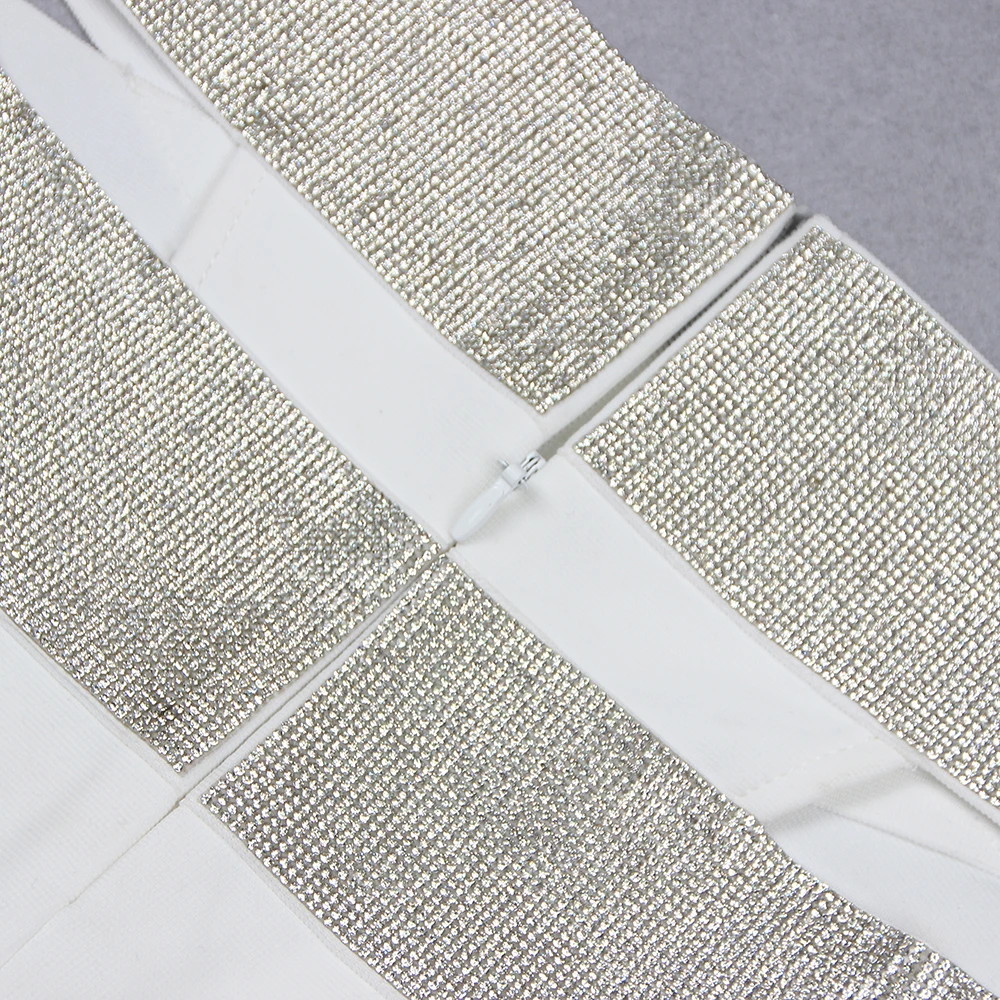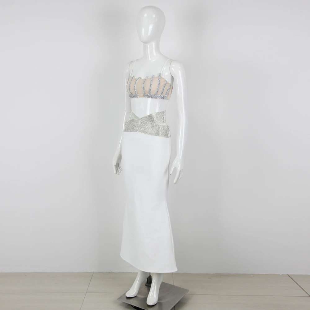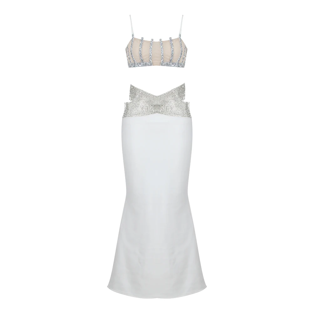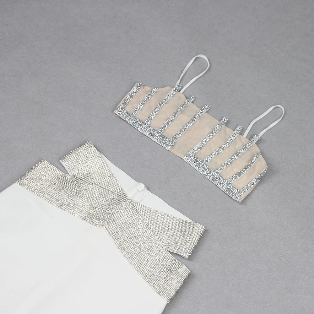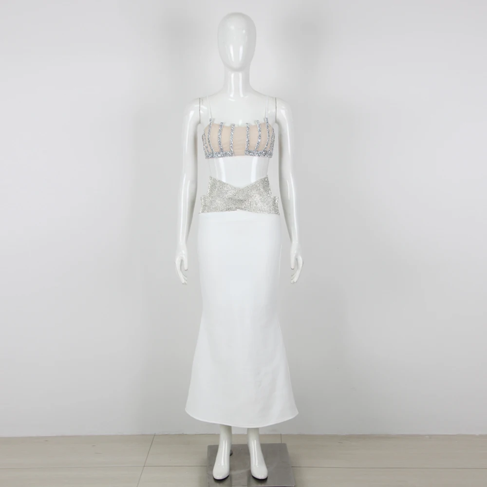 Backless Halter Diamonds Flower White Midi Bandage Skirt Set Knitted Elegant Evening Club Party Dress