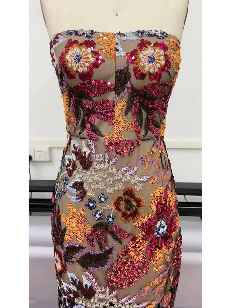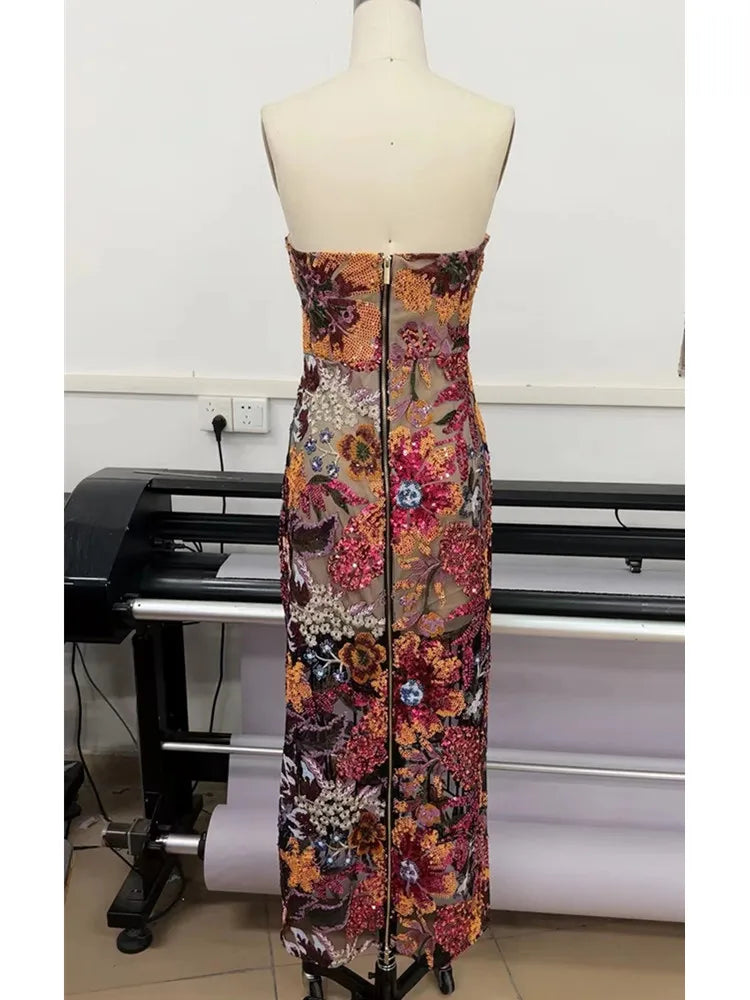 Strapless Designer Embroidery Flower Long Bodycon Gowns Dress Elegant Evening Party Club Dress